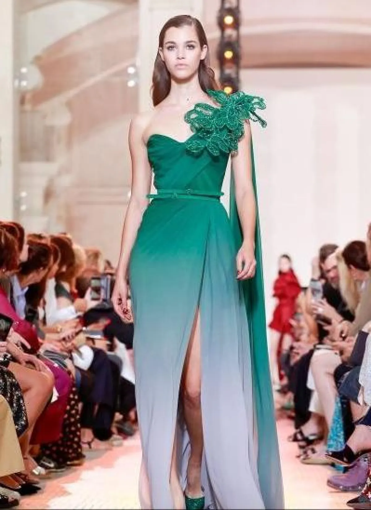 تألقي بفستان باللون الأخضر من تصميم اللبناني العالمي ايلي صعب، الذي سيمنحك إطلالة ناعمة وعصرية، تجمع بين الكلاسيكية والعصرية، خاصة مع النقوش التي زينت الكتف الواحدة.