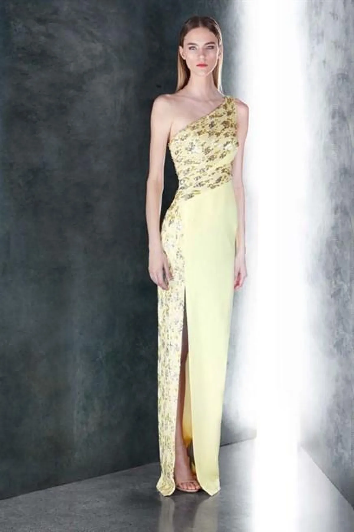 اختاري إطلالتك من تصميم باميلا رولاند، فستان يغلب عليه اللون الأصفر مع فتحة من الأمام، يعطي طابعاً كلاسيكياً مميزاً لإطلالتك.
