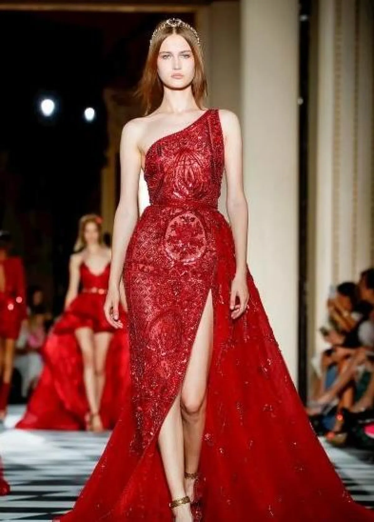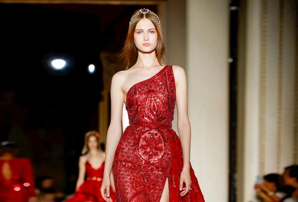 الفستان باللون الأحمر هو الأكثر رواجاً في صيف 2019، لذلك اختاري التميز بفستان بكتف واحدة باللون الأحمر من تصميم زهير مراد، الذي يتميز بالنقوش والفتحة من الأمام.