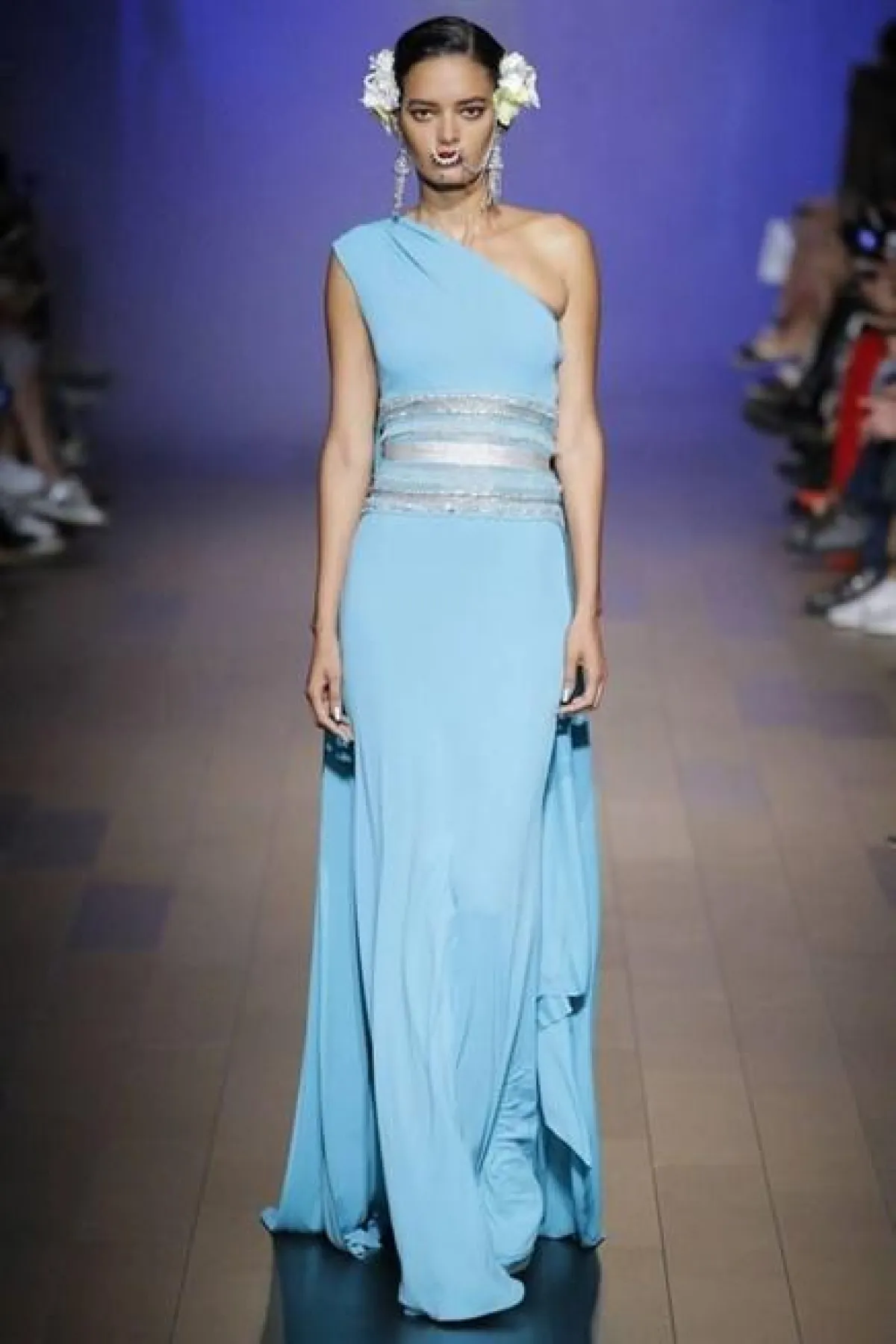 تصميم أنيق من المصمم نعيم خان، يمكنك ارتداء الفستان الطويل من اللون الأزرق وخطوط على شكل حزام من اللون الفضي، يضمن تألقكِ في مناسباتك.