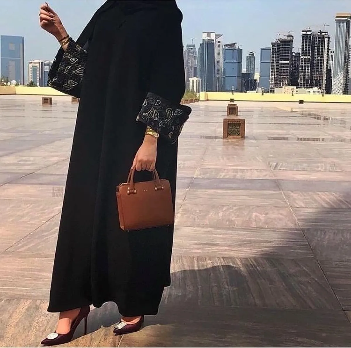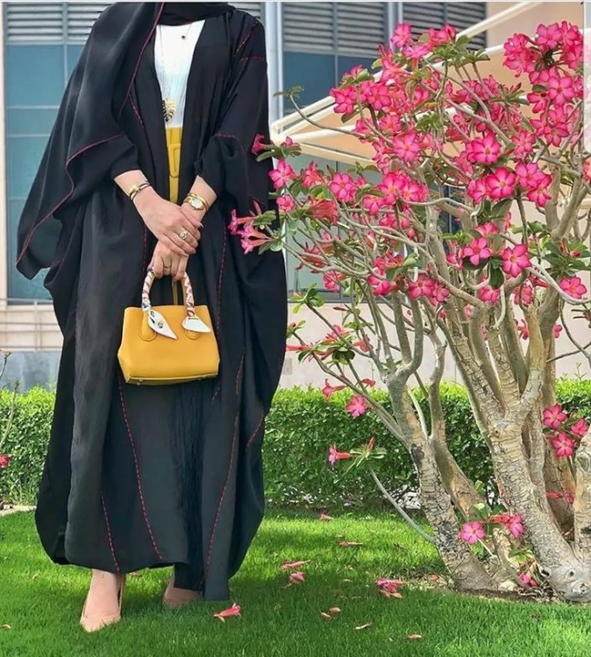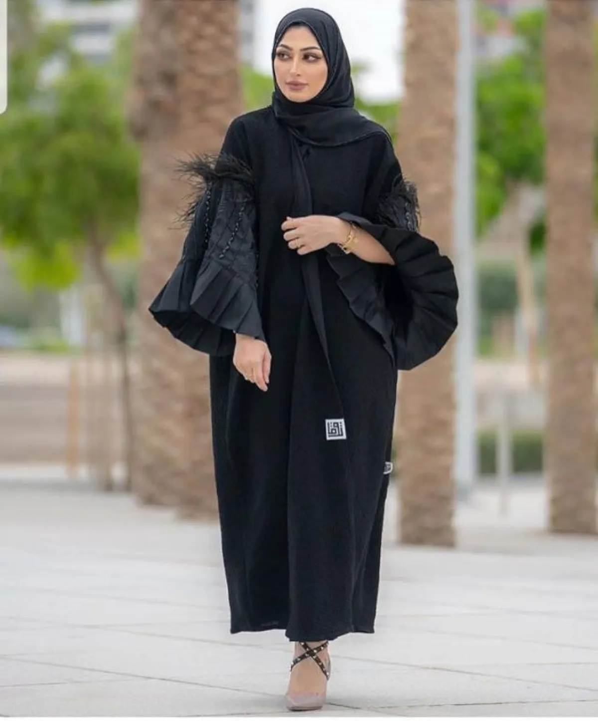 من أحدث التصاميم الدارجة هذا الصيف، هو وجود لمسات من الريش البسيطة في العباية السوداء، كهذا الموديل من Abayat ataooq عبايات طوق، ننصحك باعتمادها مع أحذية مترفة بألوان مميزة، كالأحمر مع الكريستال، لاسيما من جيمي تشو Jimmy Choo، وشنطة مترفة من علامة ديور Dior أو شانيل Chanel.
