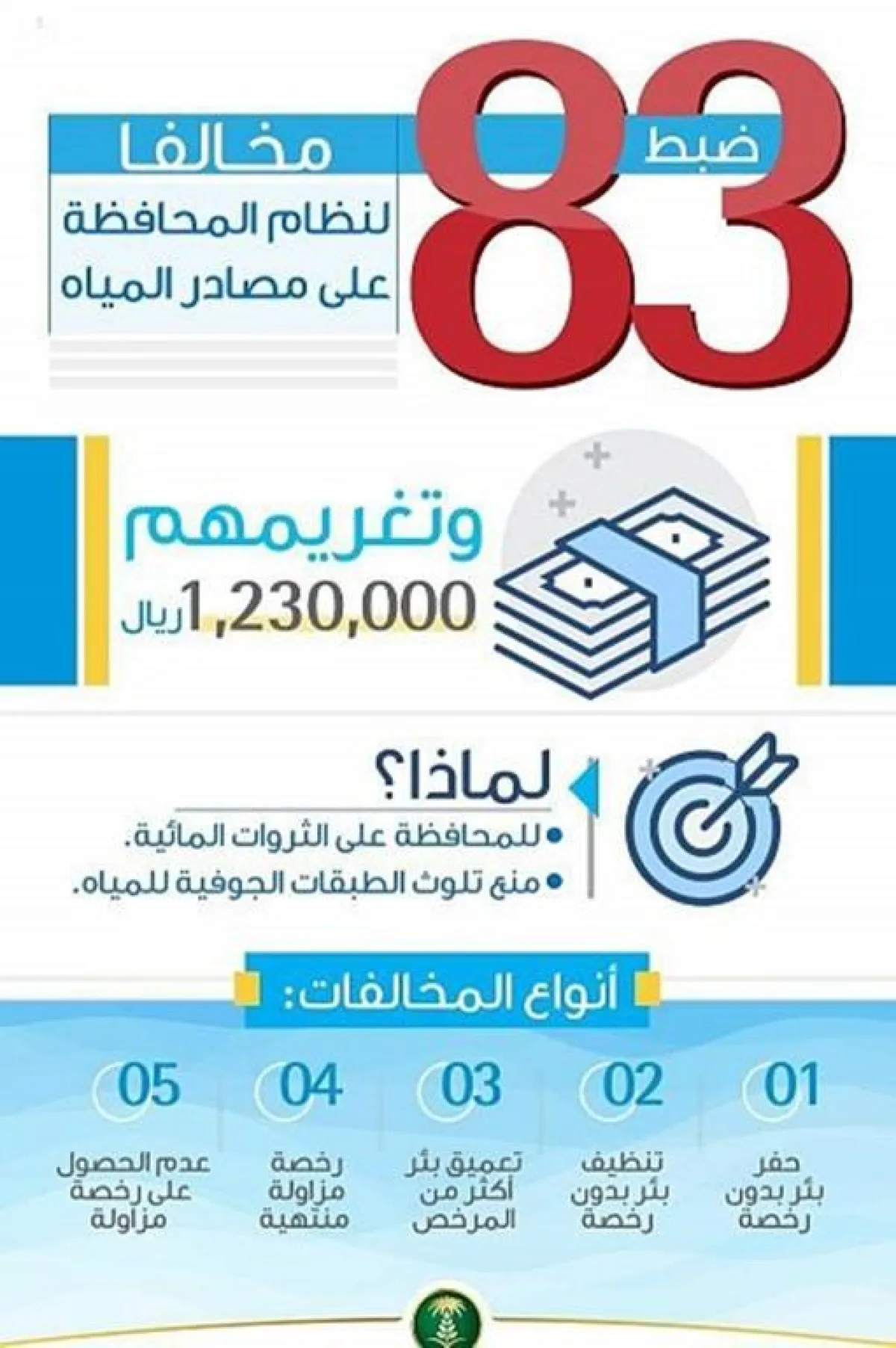 ضبطت وزارة البيئة والمياه والزراعة، 83 مخالفاً لنظام المحافظة على مصادر المياه ولائحته التنفيذية، تجاوزت قيمتها 1.23 مليون ريال وتوزعت في مناطق الرف الرسوبي والدرع العربي وذلك في مناطق الرياض، والقصيم، والمدينة المنورة، ومكة المكرمة، وحائل، والباحة، والشرقية، وتبوك.