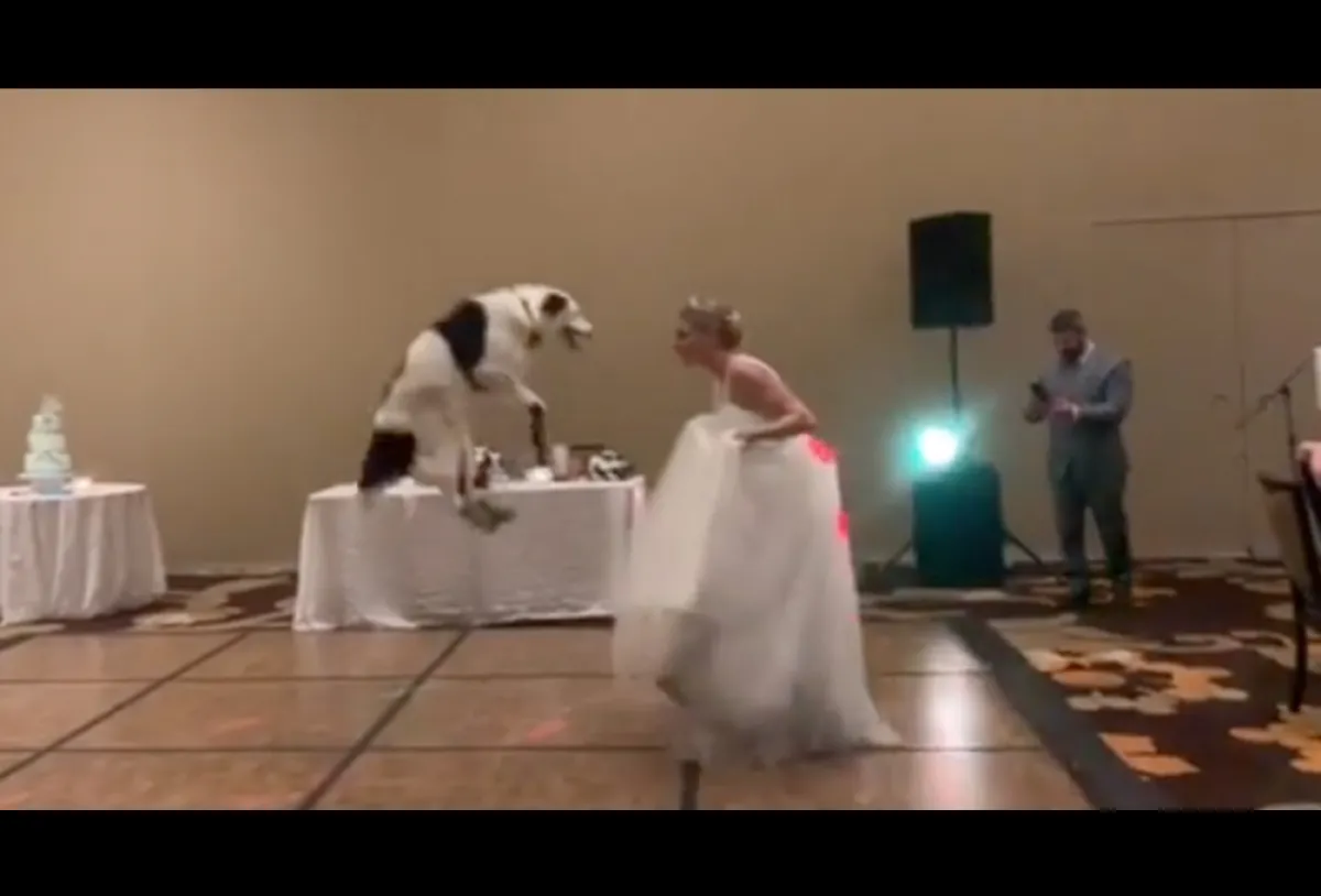 وأبقى حضور الحفل في مقاعدهم يشاهدون الرقصة الجميلة التي جمعت بين العروس وكلبها في اندهاش من التدريب العالي، ويُمكن رؤية بعض الحضور يصورون الأداء بهواتفهم الذكية.