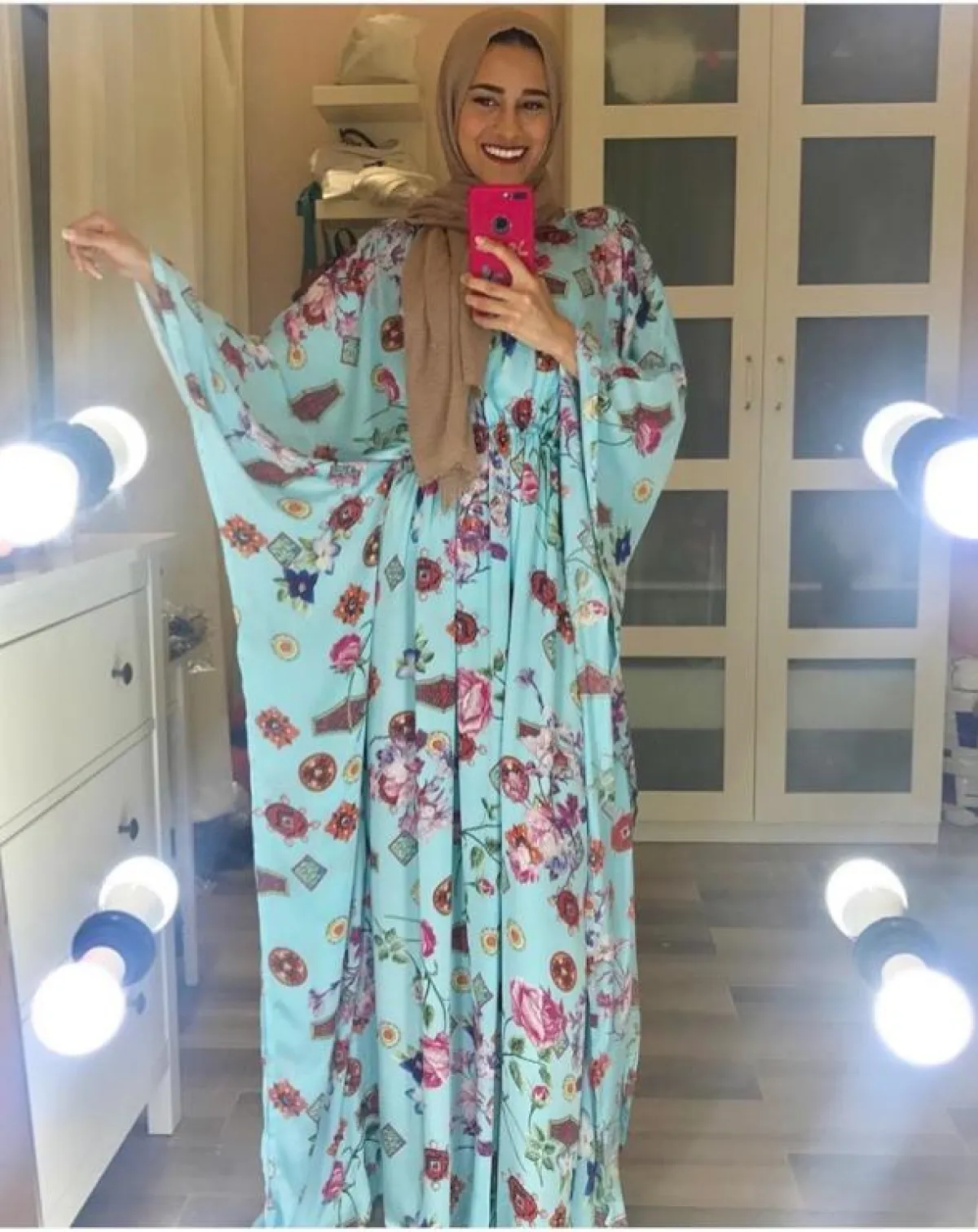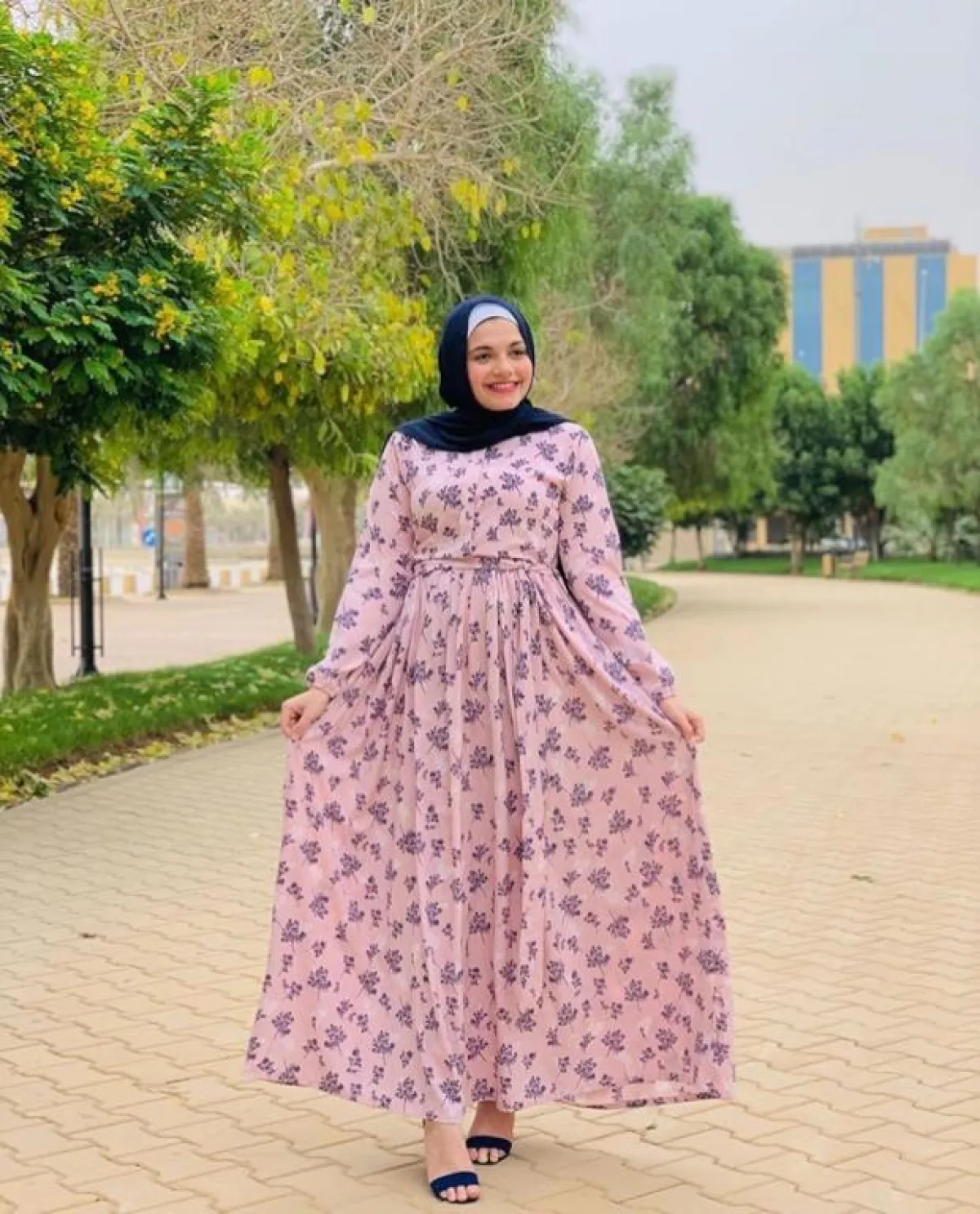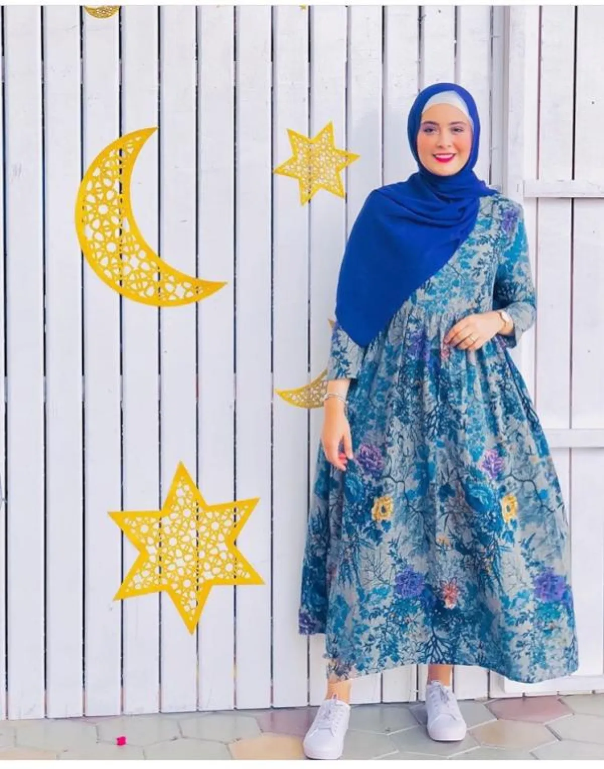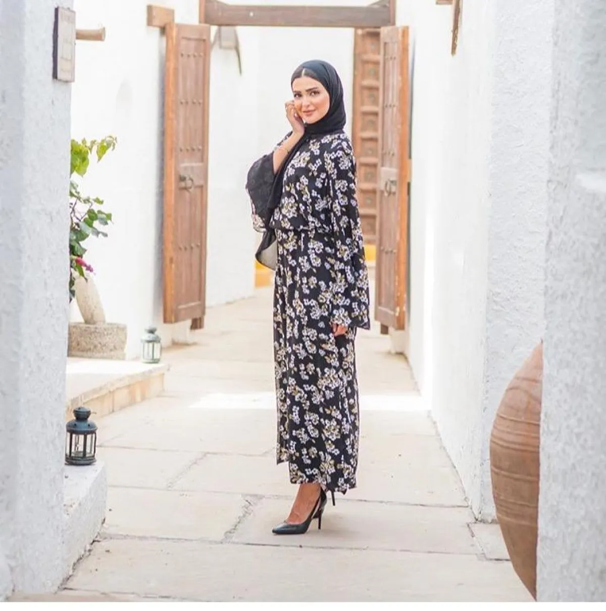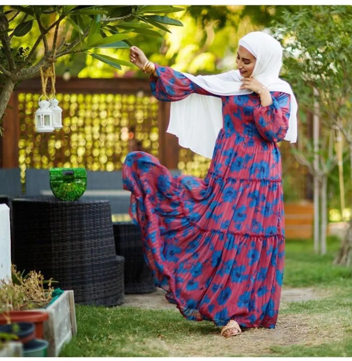 لإطلالة كاجوال سريعة وعملية، يمكنك اختيار هذا الفستان المكشكش مع الورود الزهرية، من المدونة نوف، نسقت معه حجابا باللون الأبيض لإطلالة هادئة ومريحة للعين، خاصة مع الألوان الفاقعة للفستان، ولاحظنا كذلك اختيار حذاء مفتوح أرضي ليكمل الفكرة نفسها.