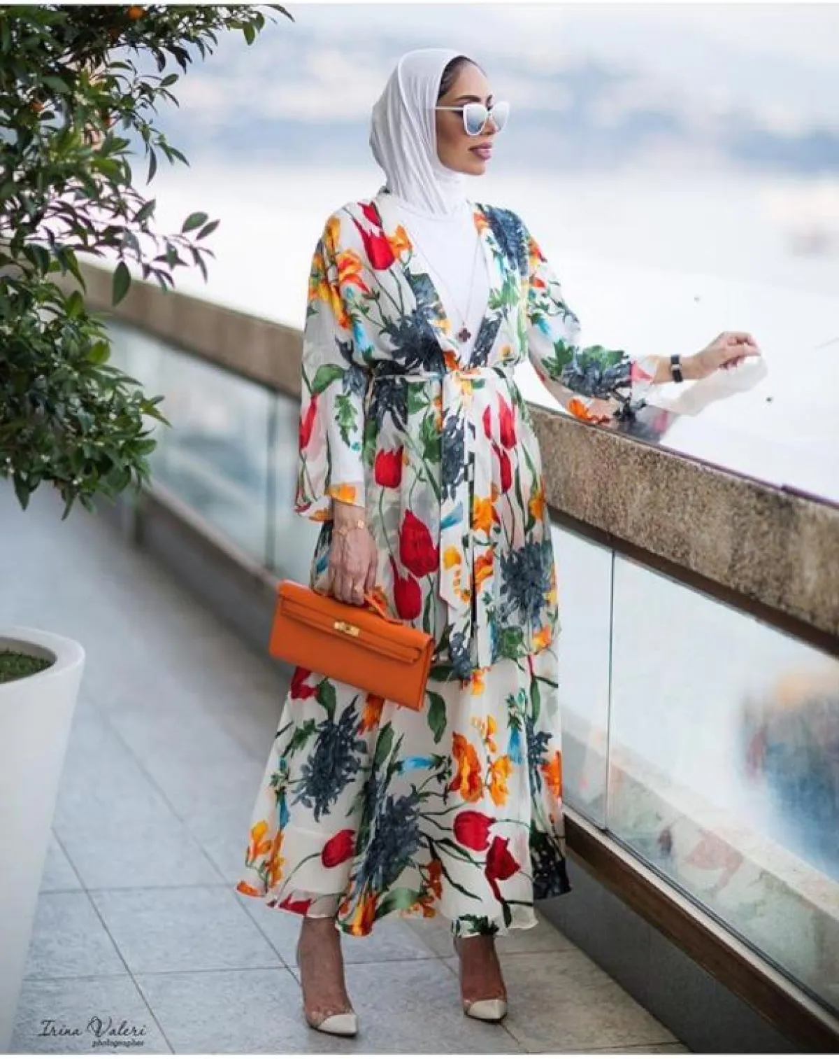 هذا الفستان يحتاج إلى توب بسيط ليناسب المحجبات، لكنه يجعلك تبدين أطول، فحرف v لطالما كان من الأفكار المناسبة للصبايا لإطلالة رشيقة، كهذا الفستان من الفاشينيستا فاطيمة مع الألوان الصيفية المبهجة، نسقت معه حذاء مدببا بدا جذابا، وشنطة مستطيلة من هيرميس Hermes باللون البرتقالي، إحدى درجات الفستان.