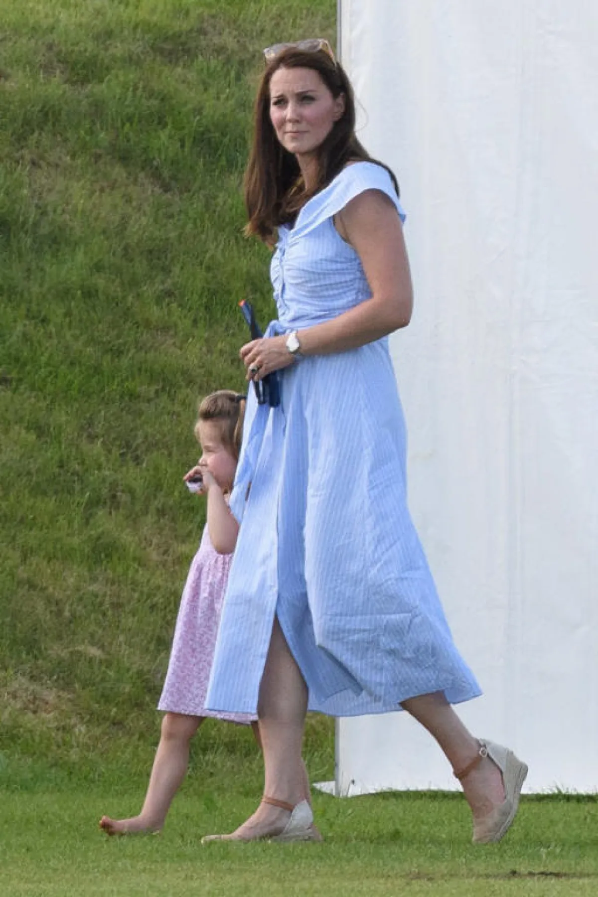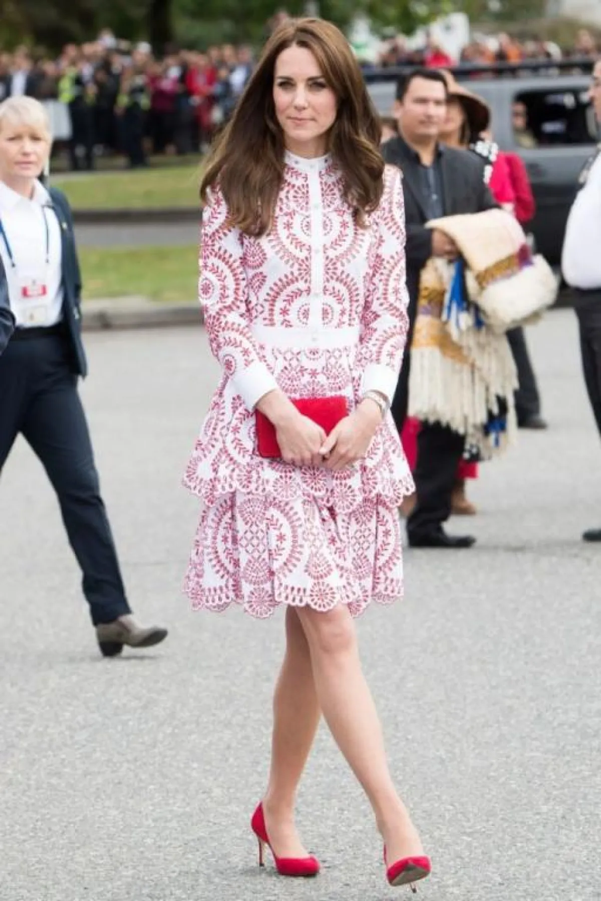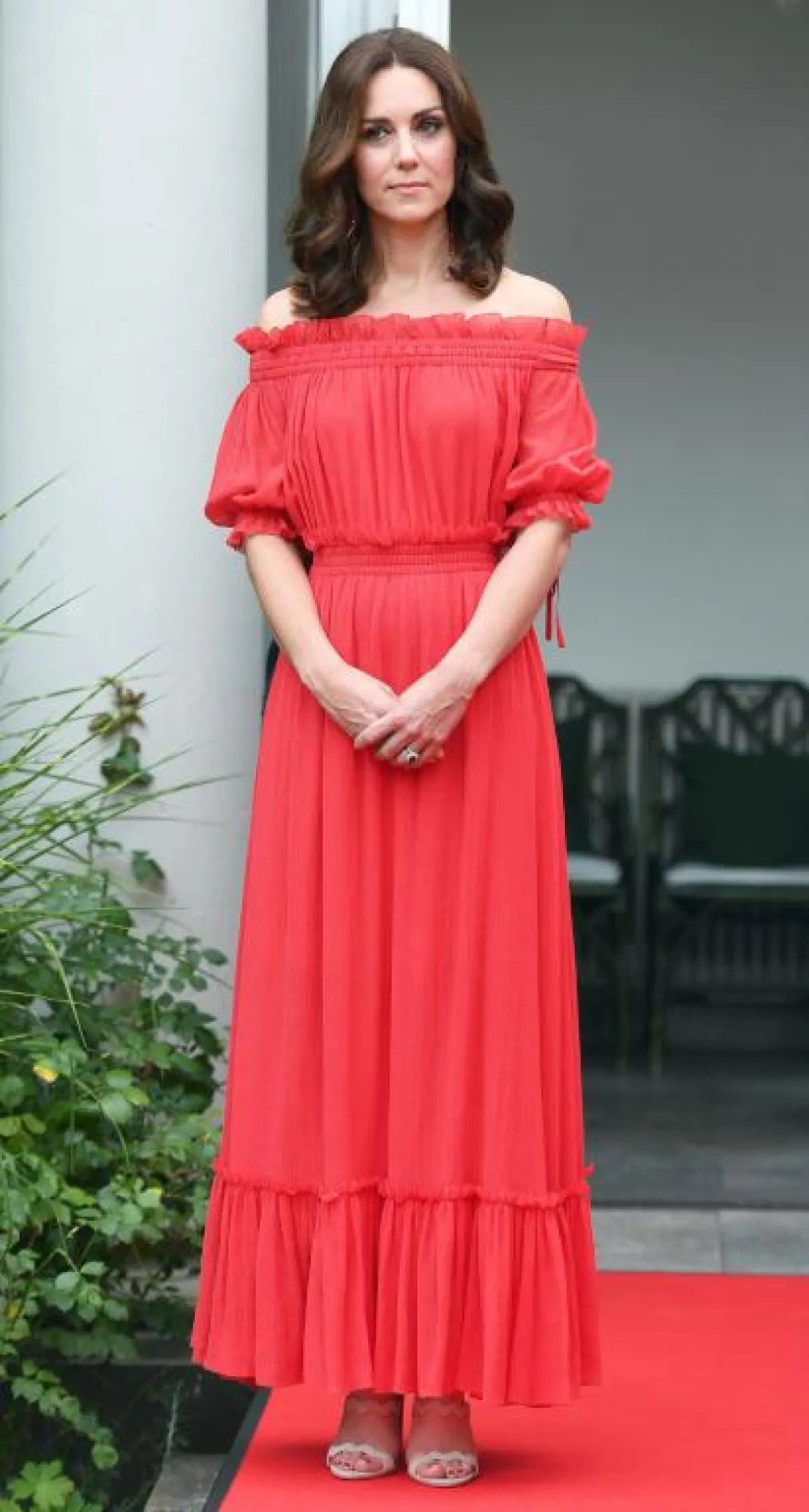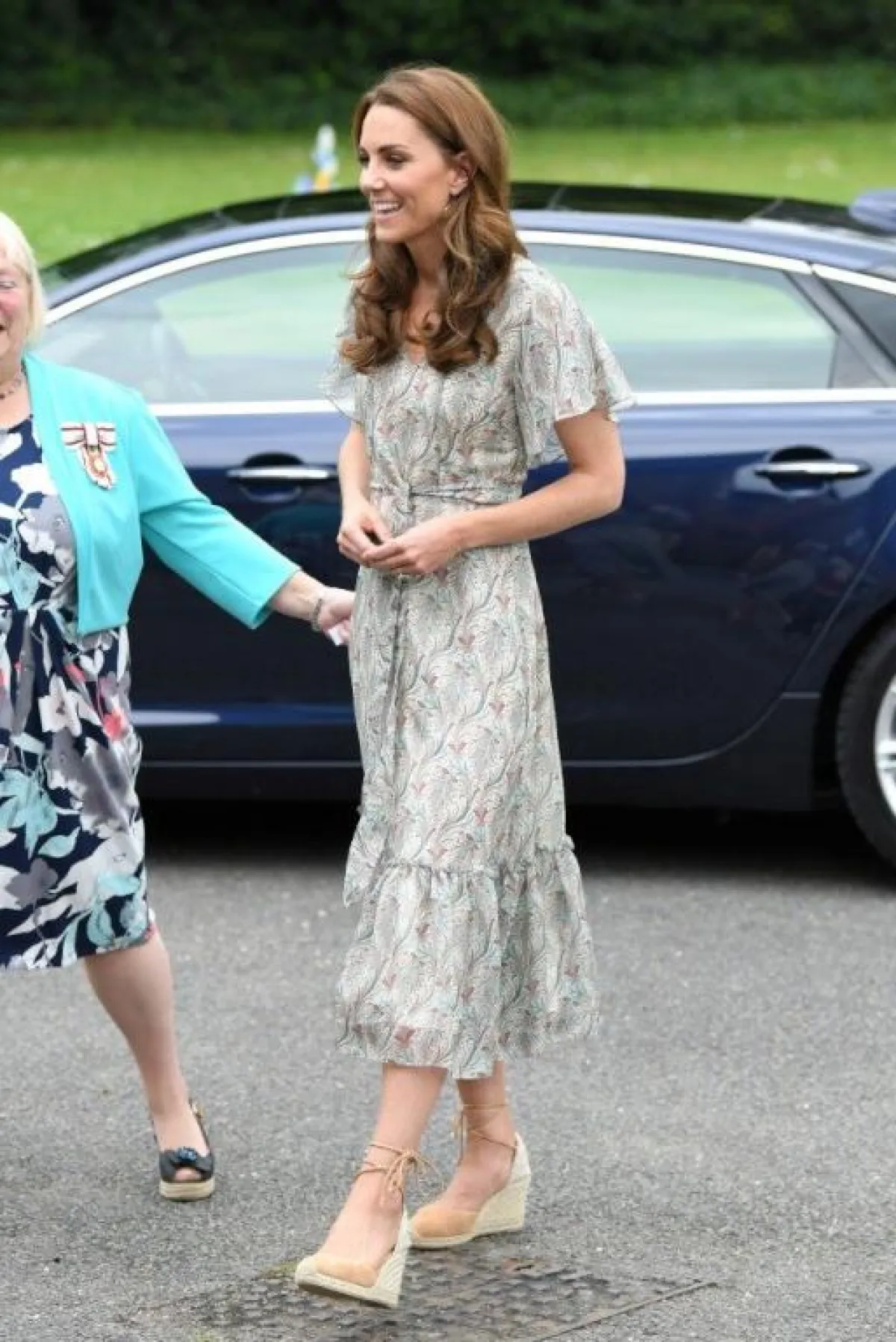 اختارت كيت ميدلتون Kate Middleton في أحد المناسبات الصباحية الكاجوال فستان ماكسي معرق بألوان تجمع بين الأحمر والأزرق والأبيض، بتصميم محافظ وأنيق وقد نسقت معه حذاء مريح مع كعب عالي مصنوع من القش وأكملت اللوك بنظارات شمسية كلاسيكية.