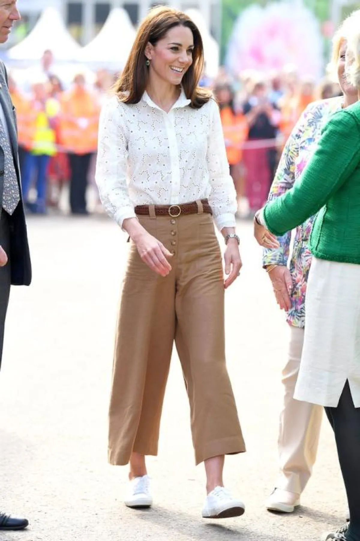 تنسيق صباحي آخر مثالي للسفر اعتمدته كيت ميدلتون Kate Middleton حيث أنها اختارت بنطلون قماشي باللون البيج الداكن بقصة أرجل واسعة وطول وصل حد الكاحل وقد زينته خصره بحزام من الجلد باللون البني، ونسقت معه قميص ناعم من القطن باللون الأبيض وحذاء رياضي عملي ومريح.