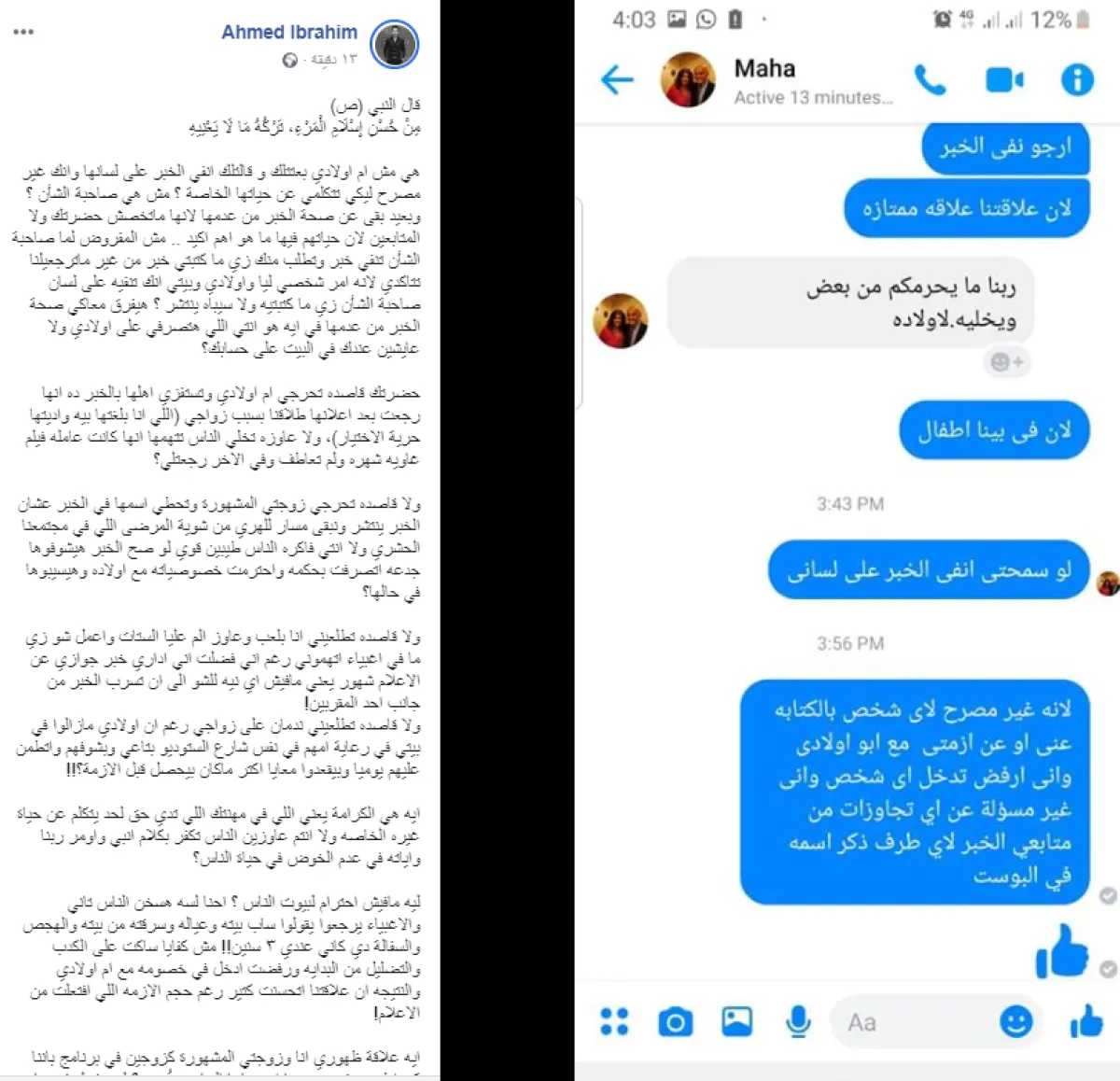 وأطلق تحذيرا جديدا قائلا: لاخر مره ماتتكلميش تاني في امور بيتي من فضلك غير مصرحلك ولا لغيرك يا استاذه يا فاضلة تكتب او تتكلم تاني عن حياتي الخاصة باي خبر سواء صح او غلط ده امر شخصي بحت مش المفروض ابرر او انفي او انزل تاكيد دي حياتي انا بس كفايه تجاوز بقى!!