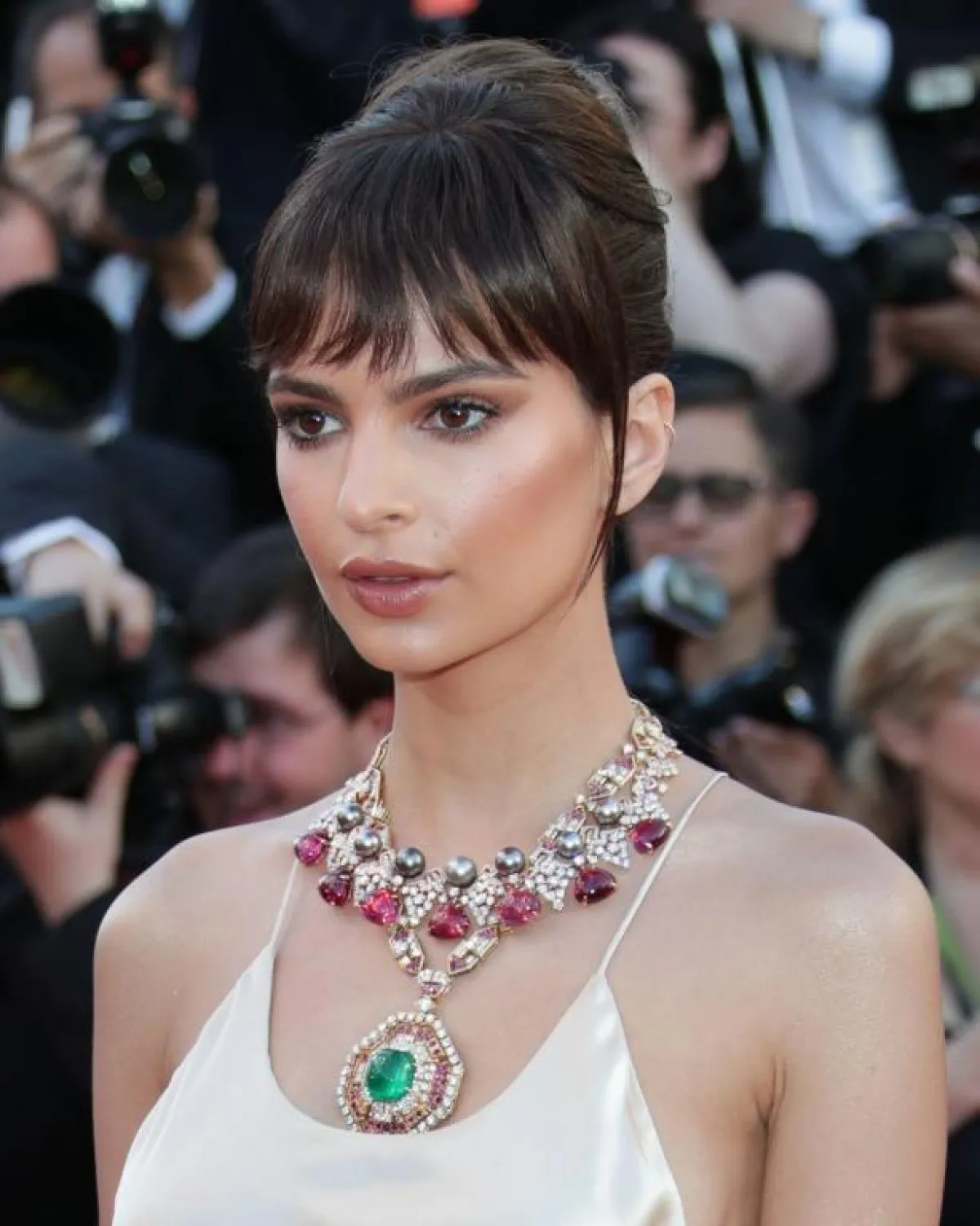 بأحد المهرجانات الكبيرة ظهرت النجمة Emily Ratajkowksi بتسريحة الشعر المرفوعة مع الغرة العريضة المتشعبة الممتدة على كلا الجانبين من الجبهة، وأطراف طويلة للخصلات، لإطلالة ملكية مستوحاة من الستينيات.