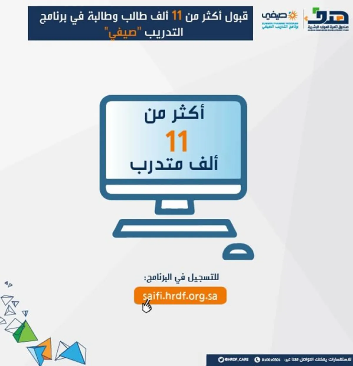 ولفت "هدف"، إلى مشاركة 1431 منشأة في القطاع الخاص في برنامج التدريب الصيفي "صيفي"، حيث طرحت 23 ألف فرصة تدريبية أمام الطلاب والطالبات الذين تم قبولهم في البرنامج. وجدد الصندوق دعوته للمنشآت والجهات التدريبية، للتسجيل في البرنامج، وعرض الفرص التدريبية عبر الرابط:http://saifi.hrdf.org.sa .