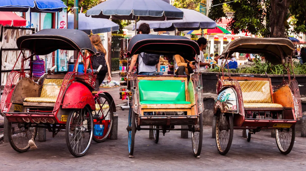 الحافلة ذات الدواليب الثلاثة من وسائل المواصلات الأكثر شيوعًا في إندونيسيا، علمًا أنَّ بعضها يتضمَّن التكييف، ومريح أثناء التنقُّل. أمَّا سيَّارات الأجرة فمُتاحة في كلِّ مكان بسهولة، وكذا هي الدرَّاجات الناريَّة. ولكن، من الهام التفاوض على الأجرة.