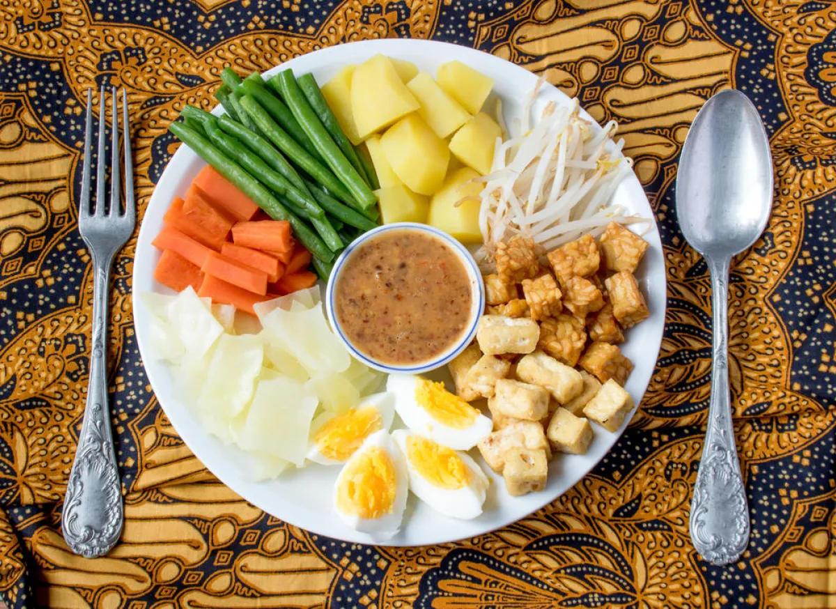 الأطباق في أندونيسيا مُنوَّعة عمومًا حسب المنطقة التي يقصدها السائحون، ومنها الأرز الأبيض اللزج، والتوفو أو التيمبيه (منتج صويا)، اللذان يرافقان كل وجبة تقريبًا. ومن الخيارات المُقترحة على السائحين: "جادو جادو"، السلطة المصنوعة من براعم الفاصولياء والملفوف والـ"تيمبيه" والتوفو والبيض المسلوق، متبّلة بصلصة الفول السوداني اللذيذة والحارة. و"ساتيه الدجاج" أي أسياخ لحم الدجاج المشوية مع صلصة الفول السوداني. ويُنصح أيضًا بتذوق "ناسي جورينج"، وهو طبق الأرز المقلي مع الخضروات والدجاج والروبيان، ويقدّم مع البيض المقلي.