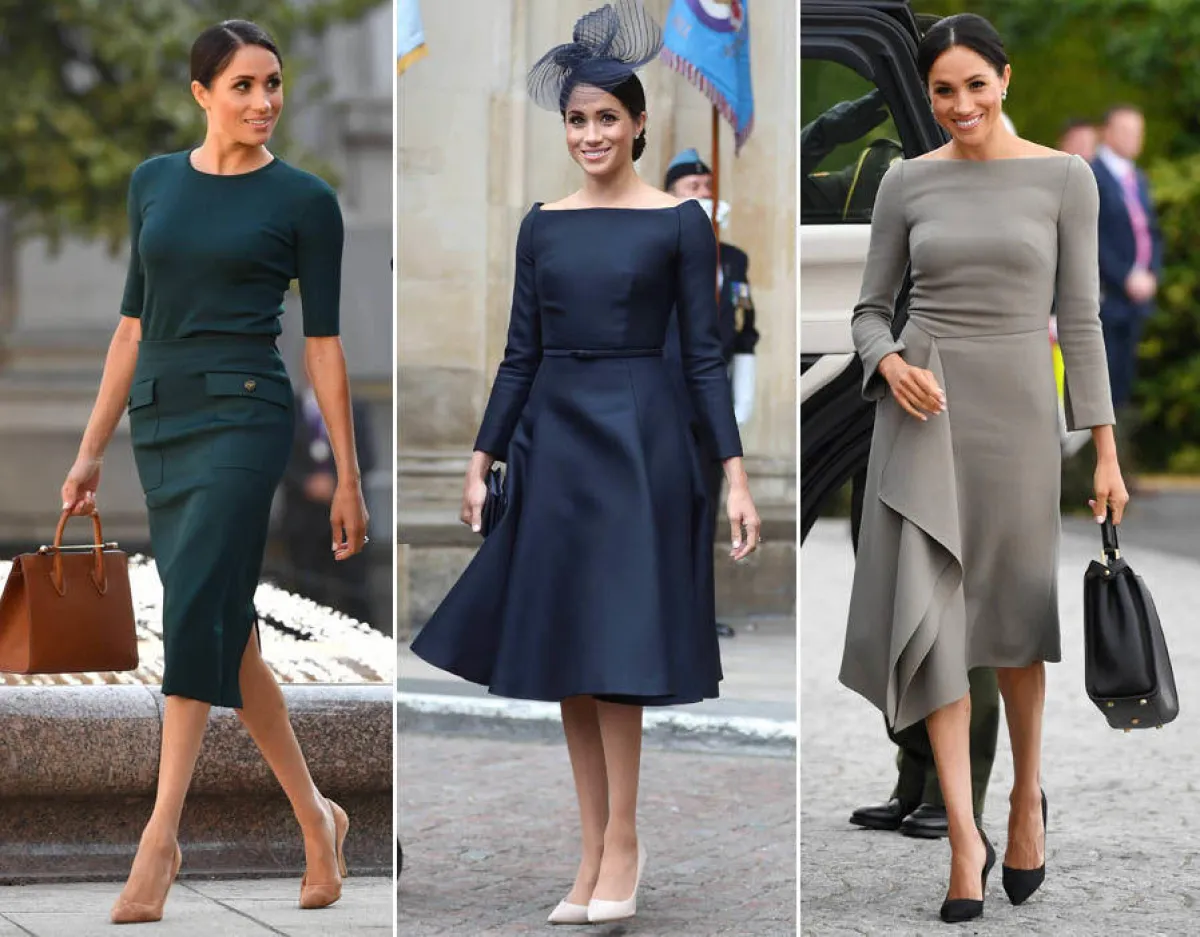 وفيما يخص الفساتين والتنانير القصيرة، استبدلتها «ميغان» بالميدي التي تغطي الركبة دائماً، وفي بعض الأحيان فساتين طويلة.