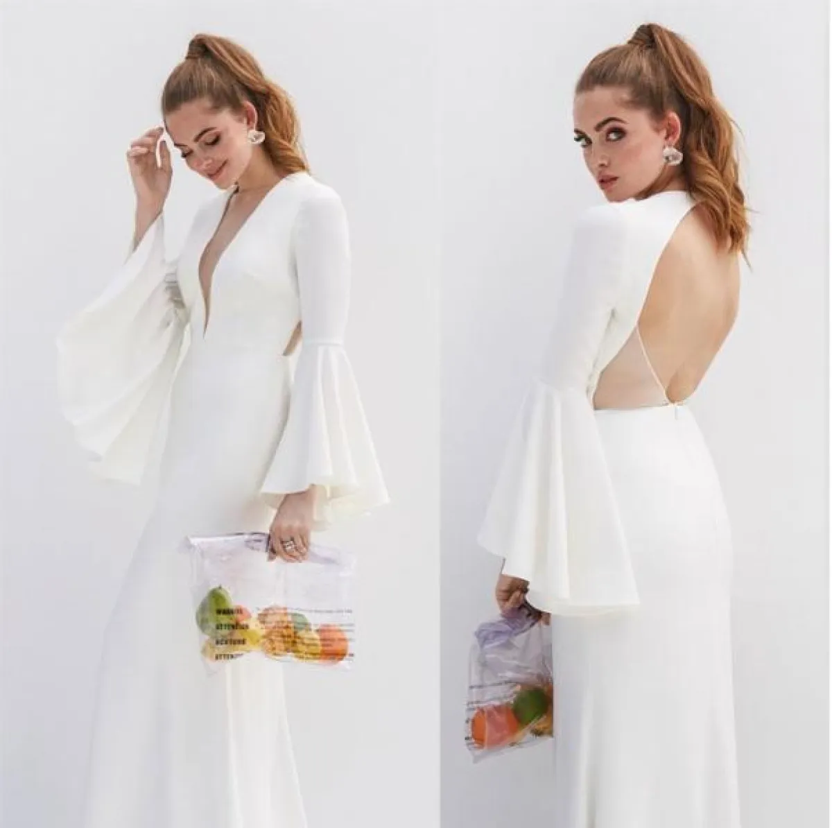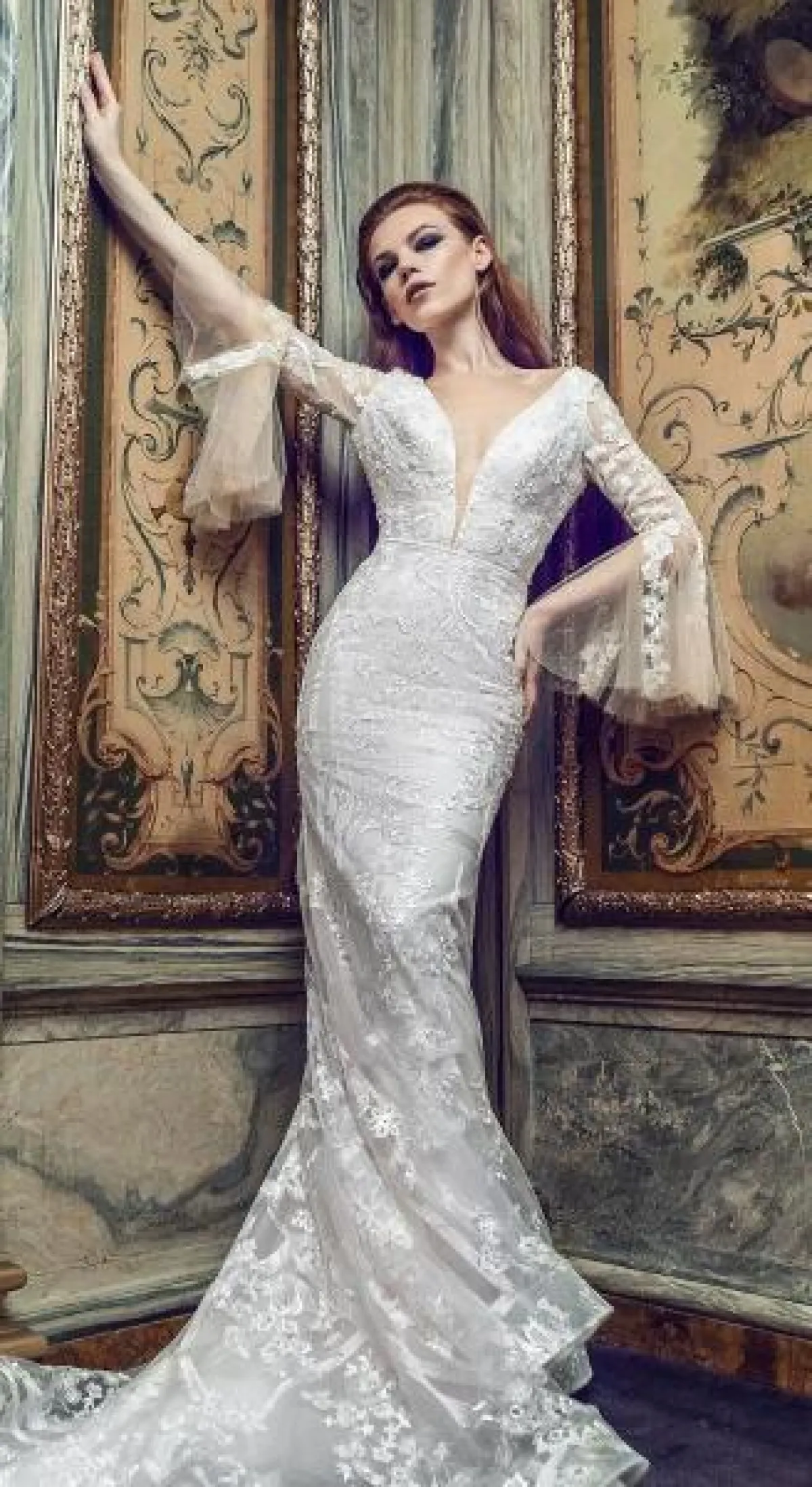 عادت مجدداً صيحة فساتين الزفاف بأكمام الجرس التي تتسع من أسفل، وعادةً ما تكون بأكمام طويلة وشفّافة.