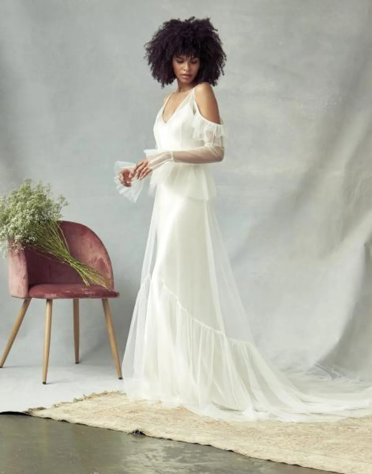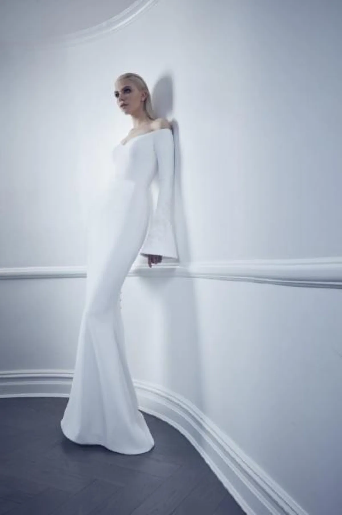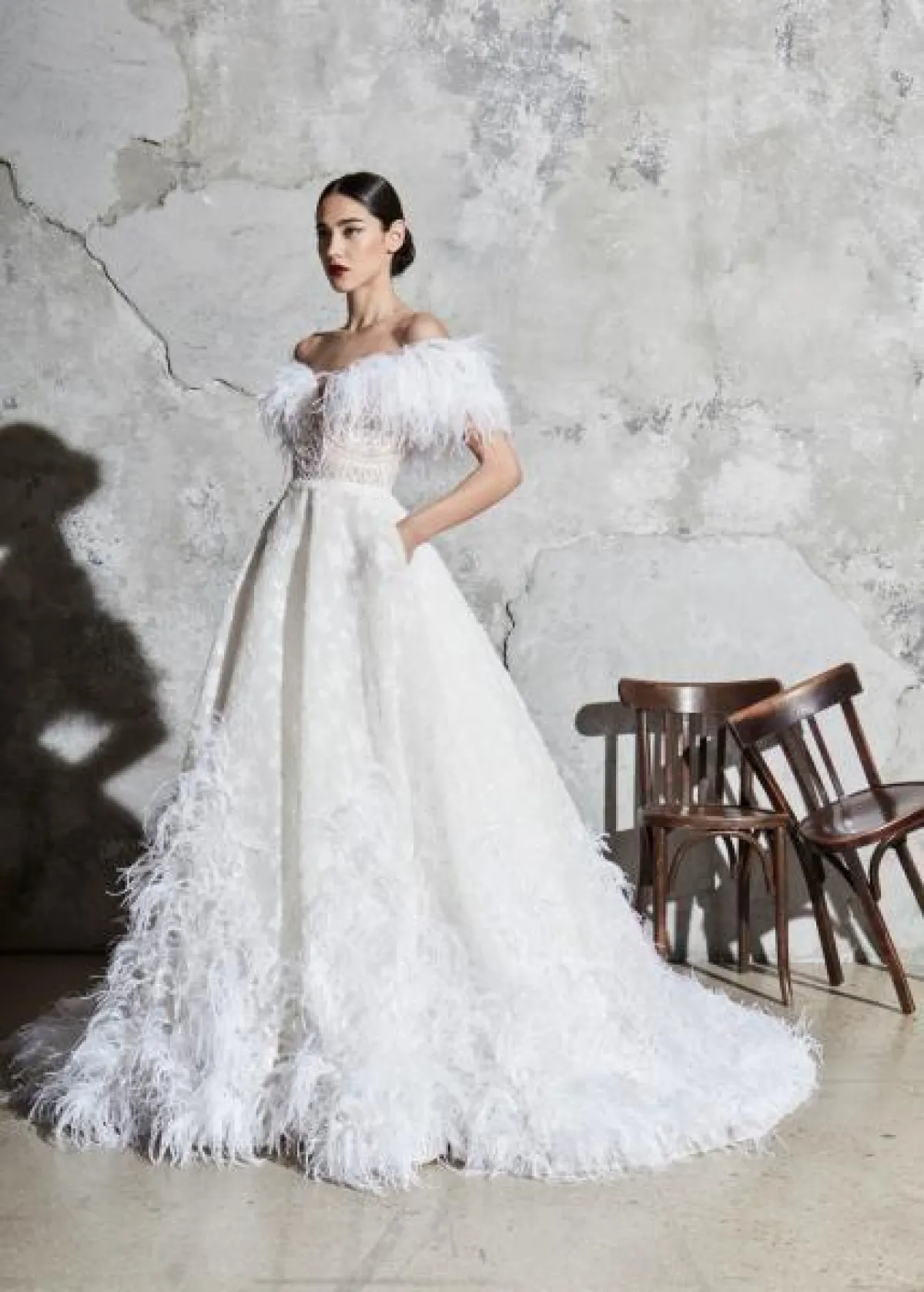 تضيف فساتين الزفاف بدون أكتاف Off Shoulder لمسة أنثوية ورومانسية لإطلالة العروس، سواء بأكمام طويلة أو حمّالات منسدلة.