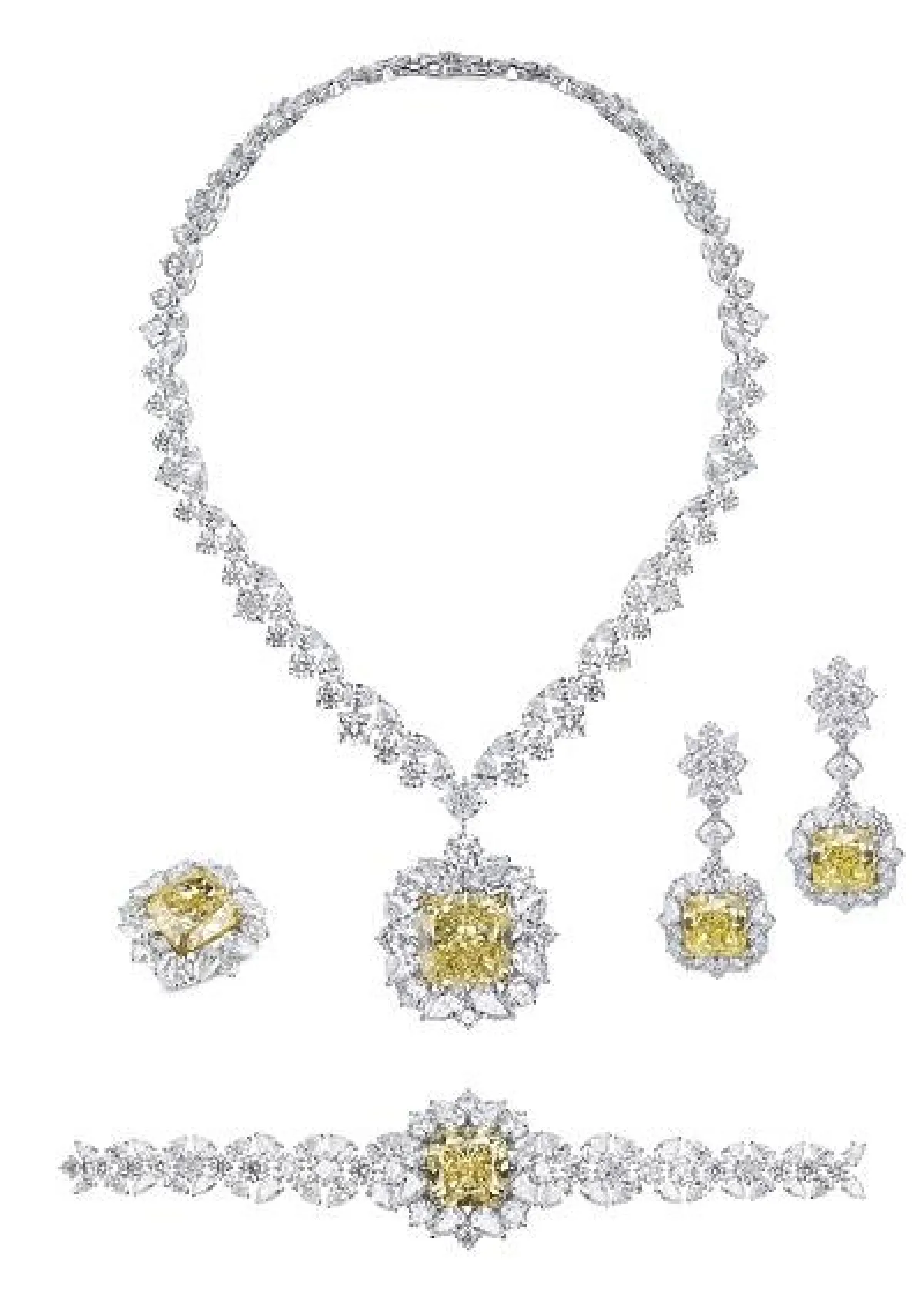 كما واخترنا من دار مجوهرات معوض Mouawad طقم من الألماس الأبيض والأصفر. فإذا كنت في صدد البحث عن مجوهرات مميزة غير تقليدية تناسب إطلالتك بفستان العرس الأبيض، ننصحك بانتقاء طقم Cinderella المميز من مجوهرات معوض Mouawad. تم تصميمه من الذهب الأبيض عيار 18 قيراطاً، وترصيعه بأفخر أنواع الألماس الأبيض وخمسة من أفخر أنواع الألماس الأصفر؛ ليعكس بذلك قصص ألف ليلة وليلة.