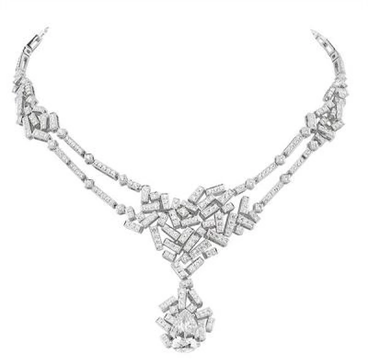 هذه القلادة مصممة من الذهب الأبيض اللماع، ومرصعة بحبيبات الألماس الأبيض الفاخر بشكل كمثري.