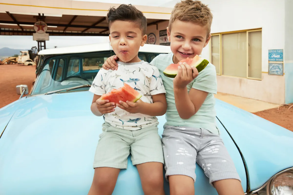 4 – صبيان يرتدي كل منهما "تيشيرت" قطني، الأول رمادي والثاني أزرق غامق من دون أكمام، فيما ينعكس تصميم الـ "شورت" فأحدهما يحاكي "تيشيرت" الآخر، بين الأزرق الغامق، والأبيض المزين بعلب البطاطا.