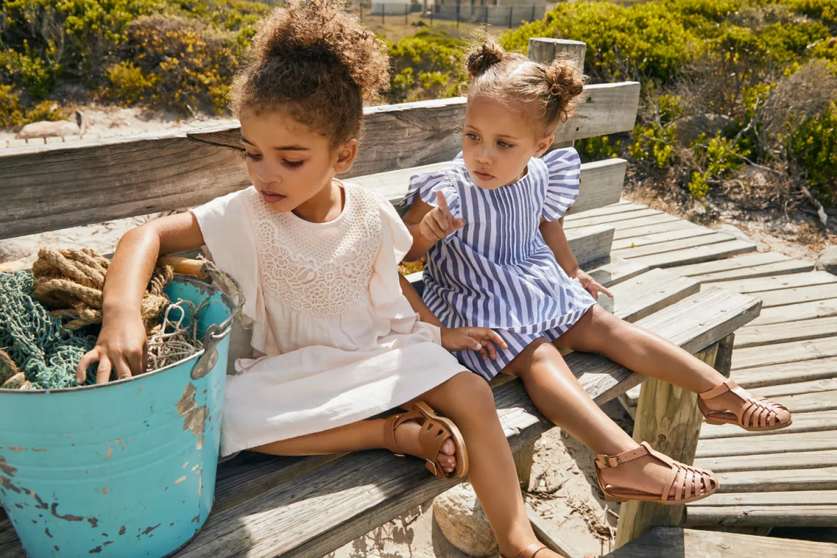 2 – طفلتان ترتديان فستانين، من قماش "اللينو" الذي يحتفظ بالبرودة، الأول زهري فاتح عريض من الأسفل، بصدرية مطرزة، والثاني رمادي مقلّم بالأزرق، مع أحذية عسلية صيفية.