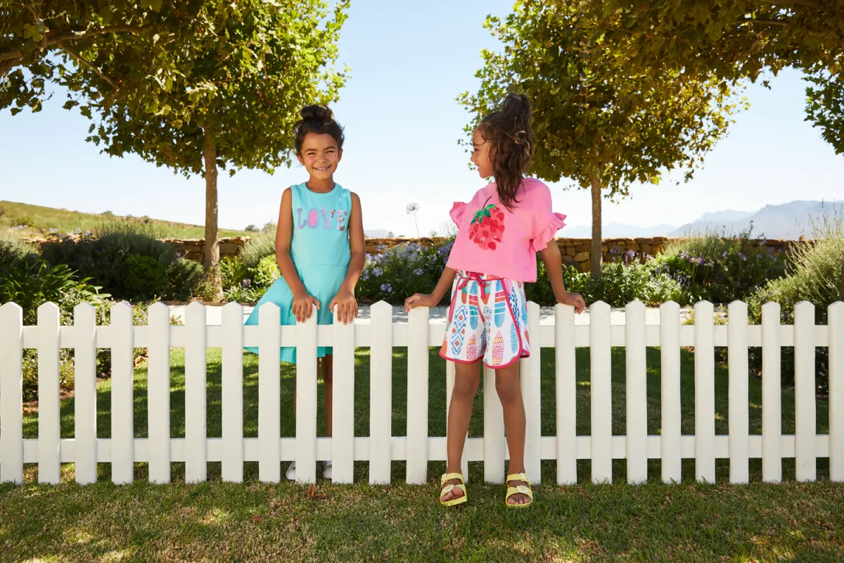3 – فتاتان ترتديان ملابس صيفية بامتياز، الأولى بلون أزرق فاتح من قماش "اللينو" مزين بطبعات براقة لكلمة حب باللغة الإنكليزية، فيما الفتاة الثانية ترتدي "شورت" ملوناً وتوبْ زهرياً، مزيناً بطبعة لثمرة الفريز الحمراء والزهرية.
