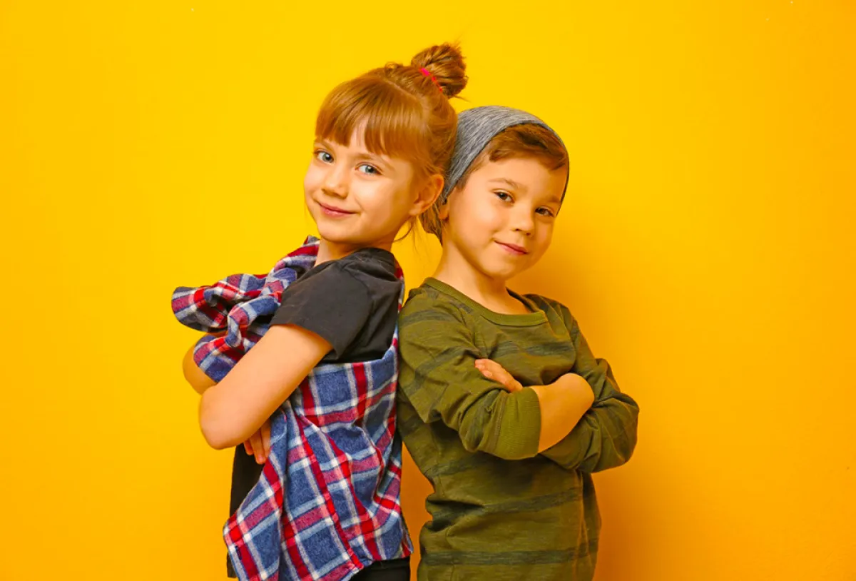 5 – فتاة ترتدي توبْ طويلاً بمشغولات مخرمة، وبنطلون ليكرا زهري، فيما الصبي يرتدي "تيشيرت" رمادي وزهري ينسجم مع القميص الذي يعلوه، والشورت الأبيض الكاجوال.
