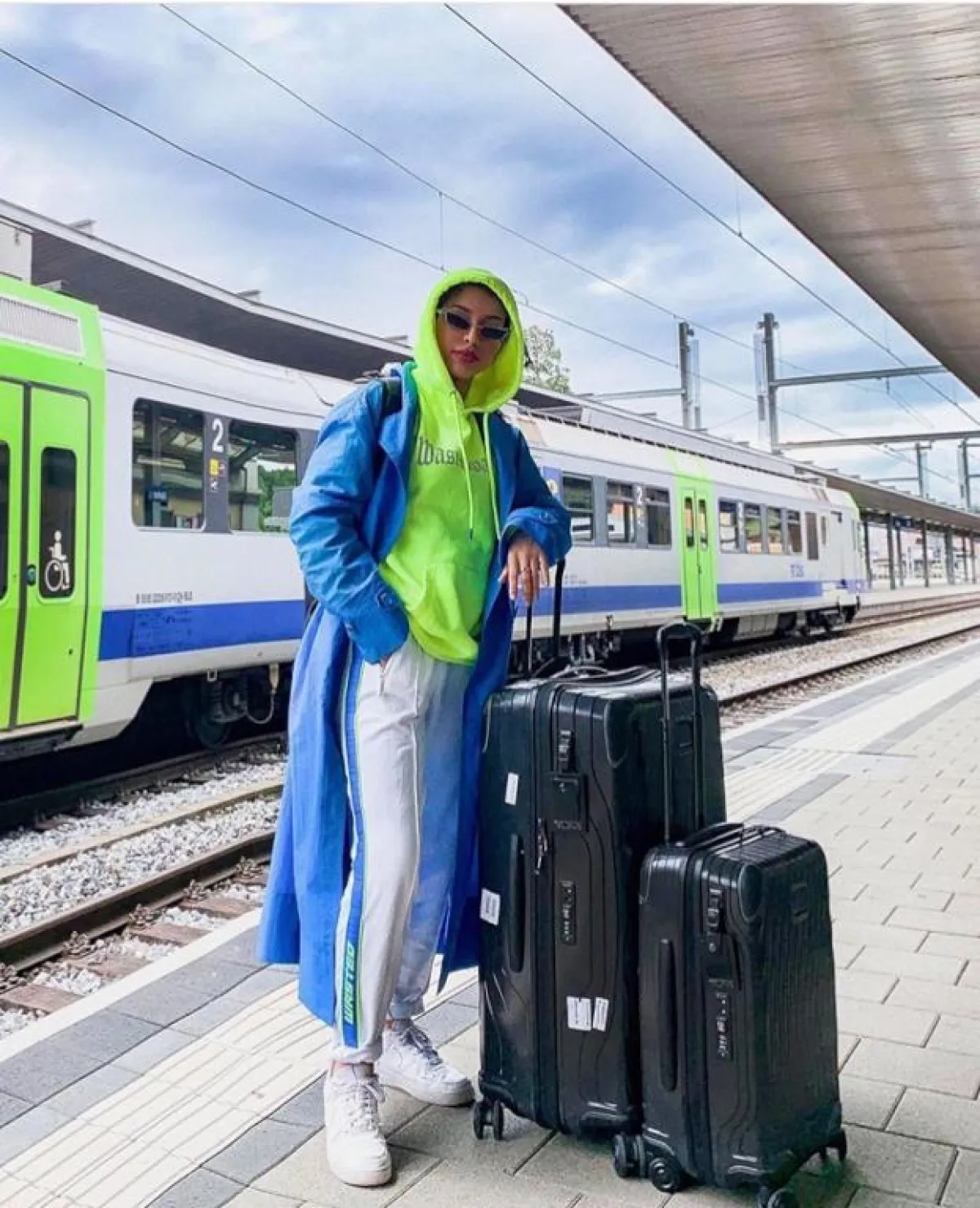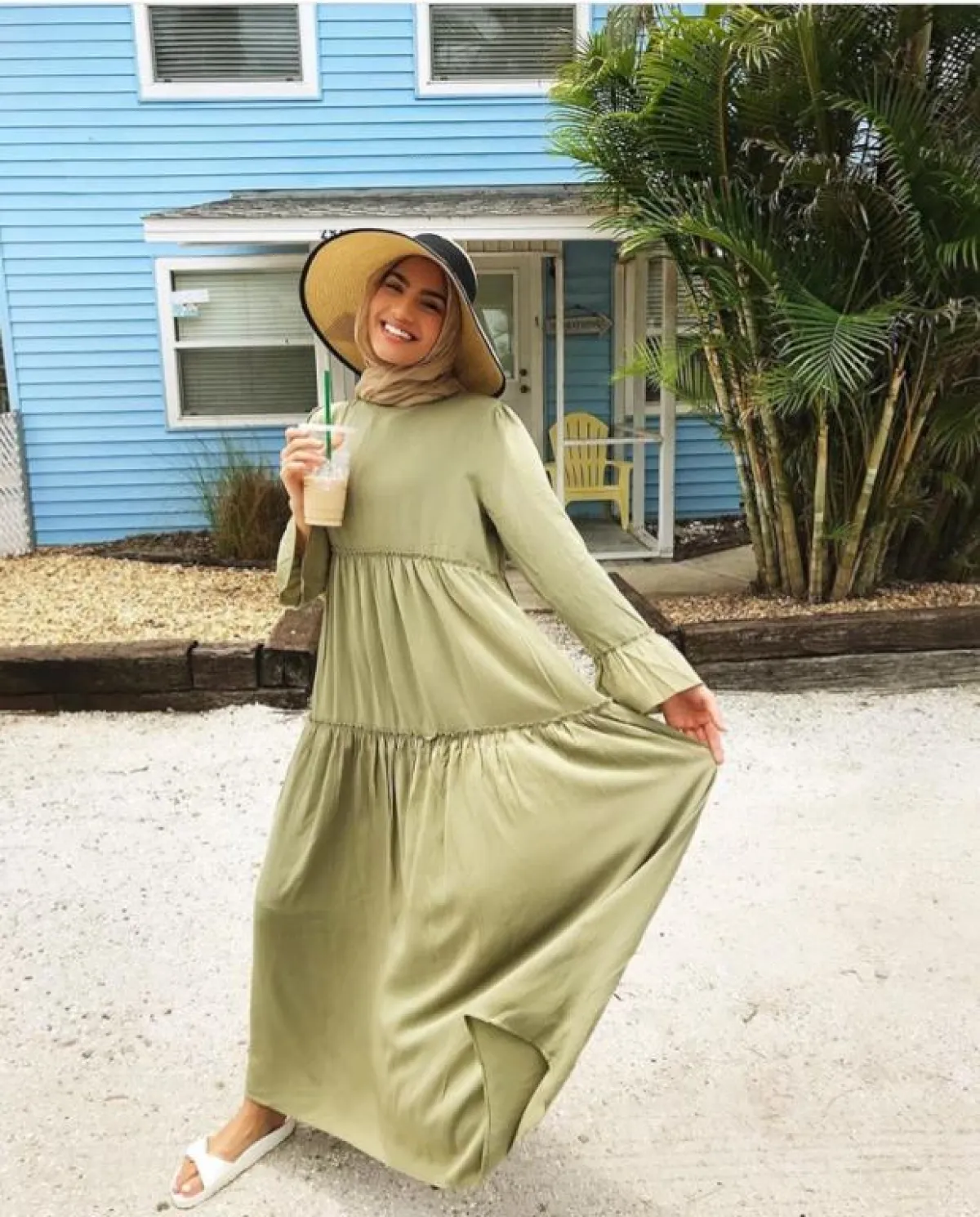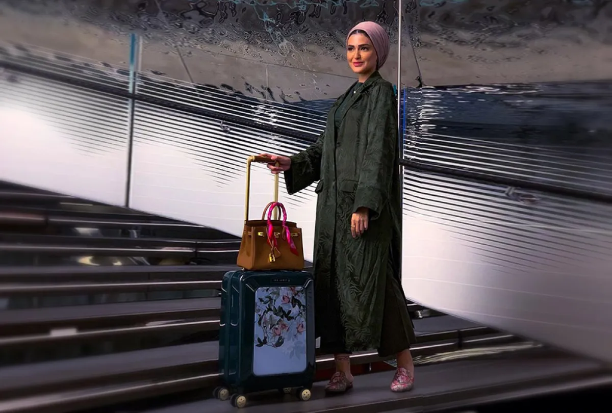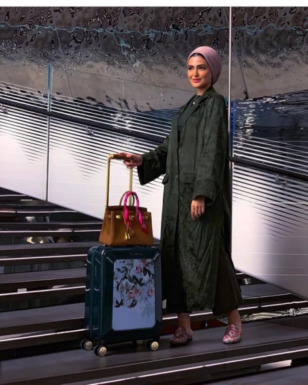 في إحدى رحلاتها اعتمدت المدونة حنين الصيفي عباية باللون الأخضر مع رسومات الورود، نسقت معها حذاءً أنيقًا مترفًا بتصميم الـ Mule، مع رسومات ورود فخمة كذلك، أما الحقيبة فكانت كبيرة الحجم من دار هيرميس Hermes، وما لفتنا هو اختيارها لحقيبة السفر مع رسومات ورود متاغمة مع العباية أيضًا.