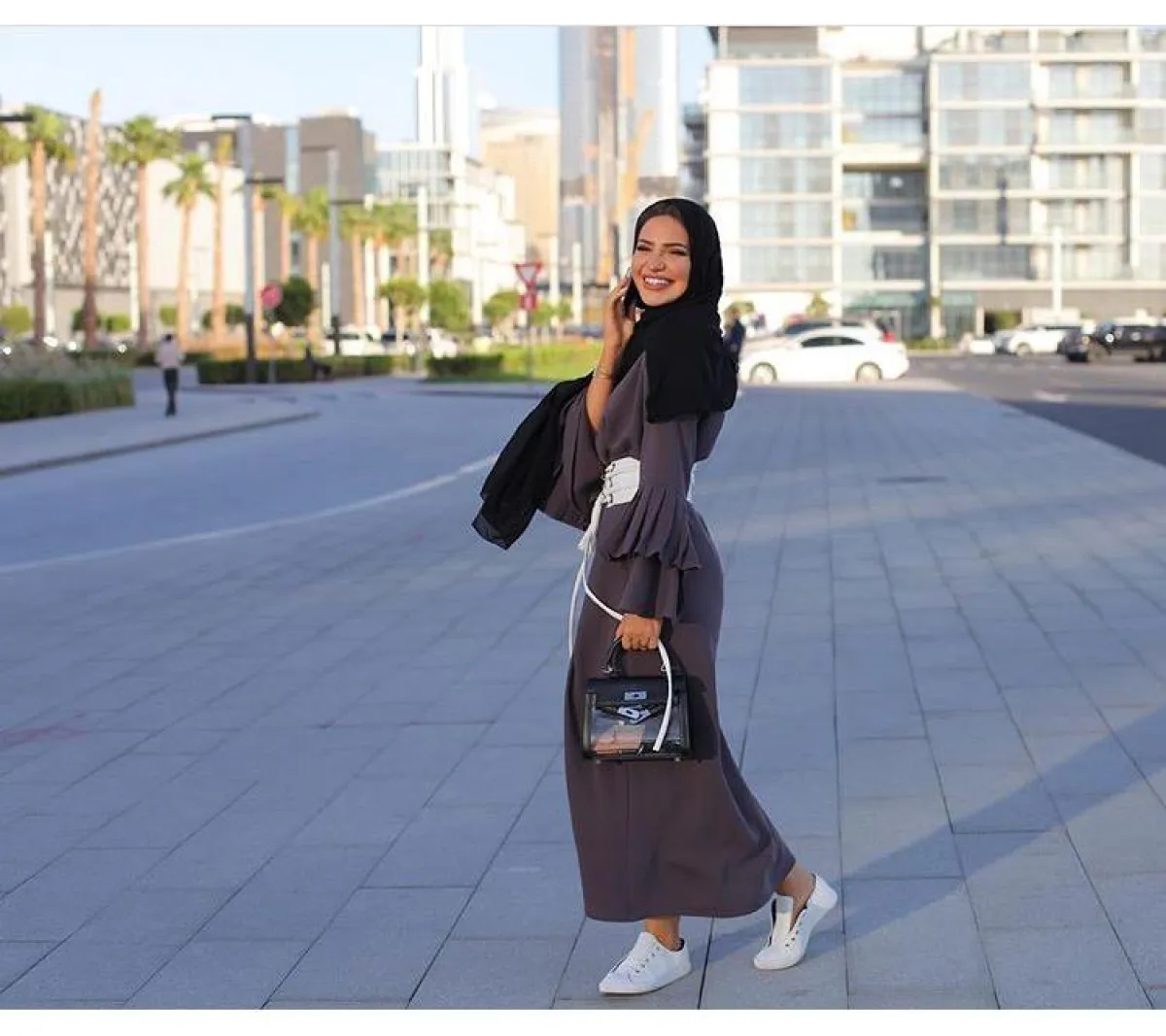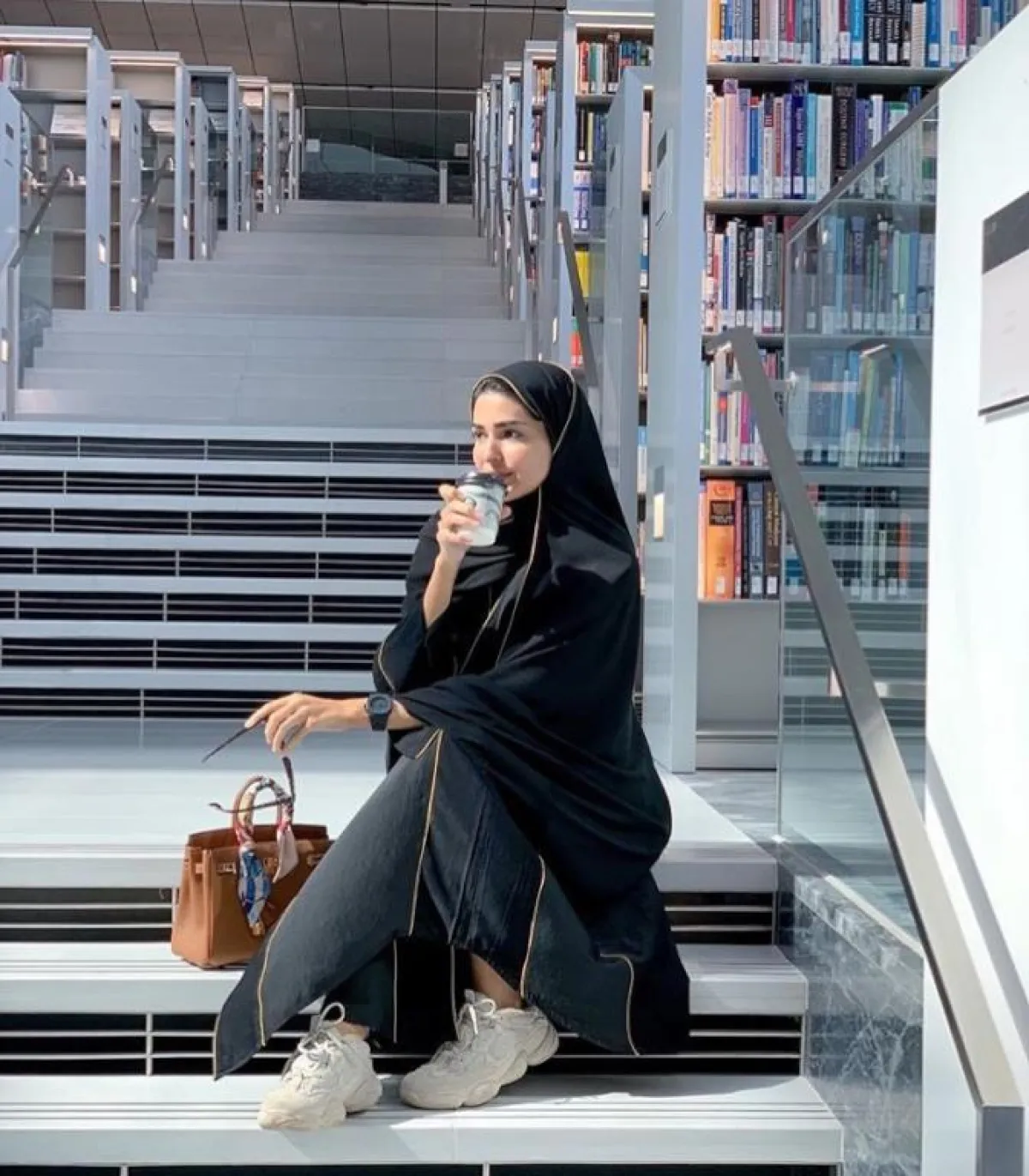 يمكنكِ اعتماد العبايات مع حزام الخصر لاطلالة رشيقة، وبالوقت نفسه الحزام يجعل مقاس العباية مناسبًا لكِ أكثر، بخاصة مع التصميمات المفتوحة لسهولة التحرك، يمكنكِ اختيار هذا اللوك من فاطمة حسام، مع حزام الخصر العريض الأبيض، الذي نسقت معه سنيكر أبيض، وشنطة متوسطة الحجم، يمكنكِ استبدالها بواحدة أكبر بالستايل نفسه، فهذه الحقيبة عملية كذلك.