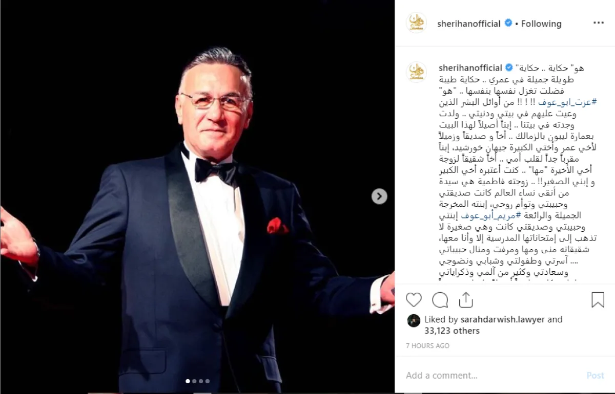 شريهان وصفت مشوار العمر مع عزت أبو عوف ب"الحكاية الطويلة الجميلة" وقالت تعليقا على ألبوم صور نادرة نشرته عبر حسابها بموقع إنستقرام: "هو" حكاية .. حكاية طويلة جميلة في عمري .. حكاية طيبة فضلت تغزل نفسها بنفسها .. "هو" #عزت_ابو_عوف !!