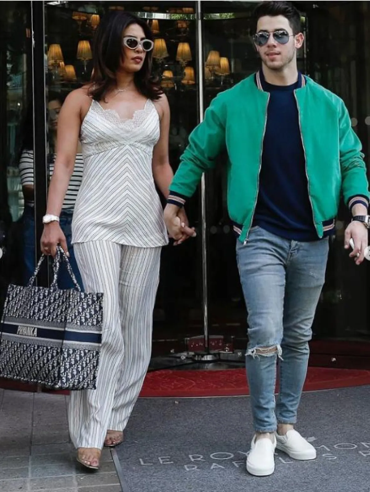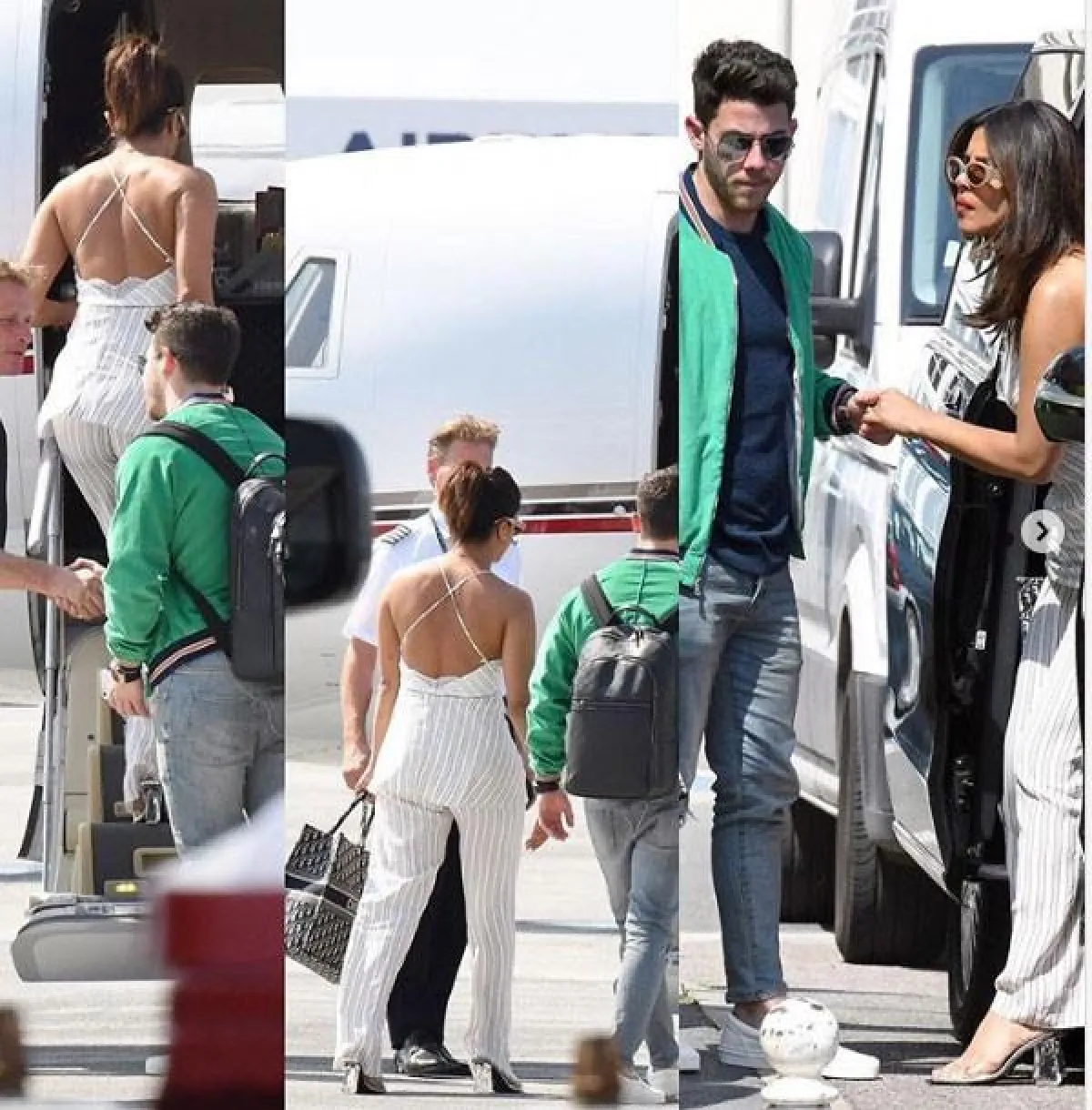 وقد رصد «الباباراتزي» الزوجيْن «بريانكا ونيك» وهما يصعدان إلى الطائرة الخاصة بهما، وفي حين أن «بريانكا» تبدو متألقة في ثوب به تنسيقات بيضاء مخططة، مع ظلال مطابقة وكعب زجاجي، إلا أن «نيك» حافظ على إطلالته غير الرسمية، كما تم التقاط الصور لوالدة بريانكا «مادو شوبرا» التي كانت معهما.