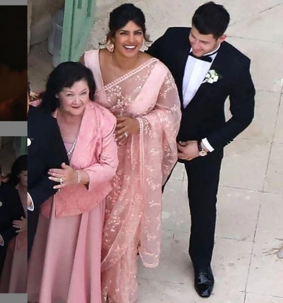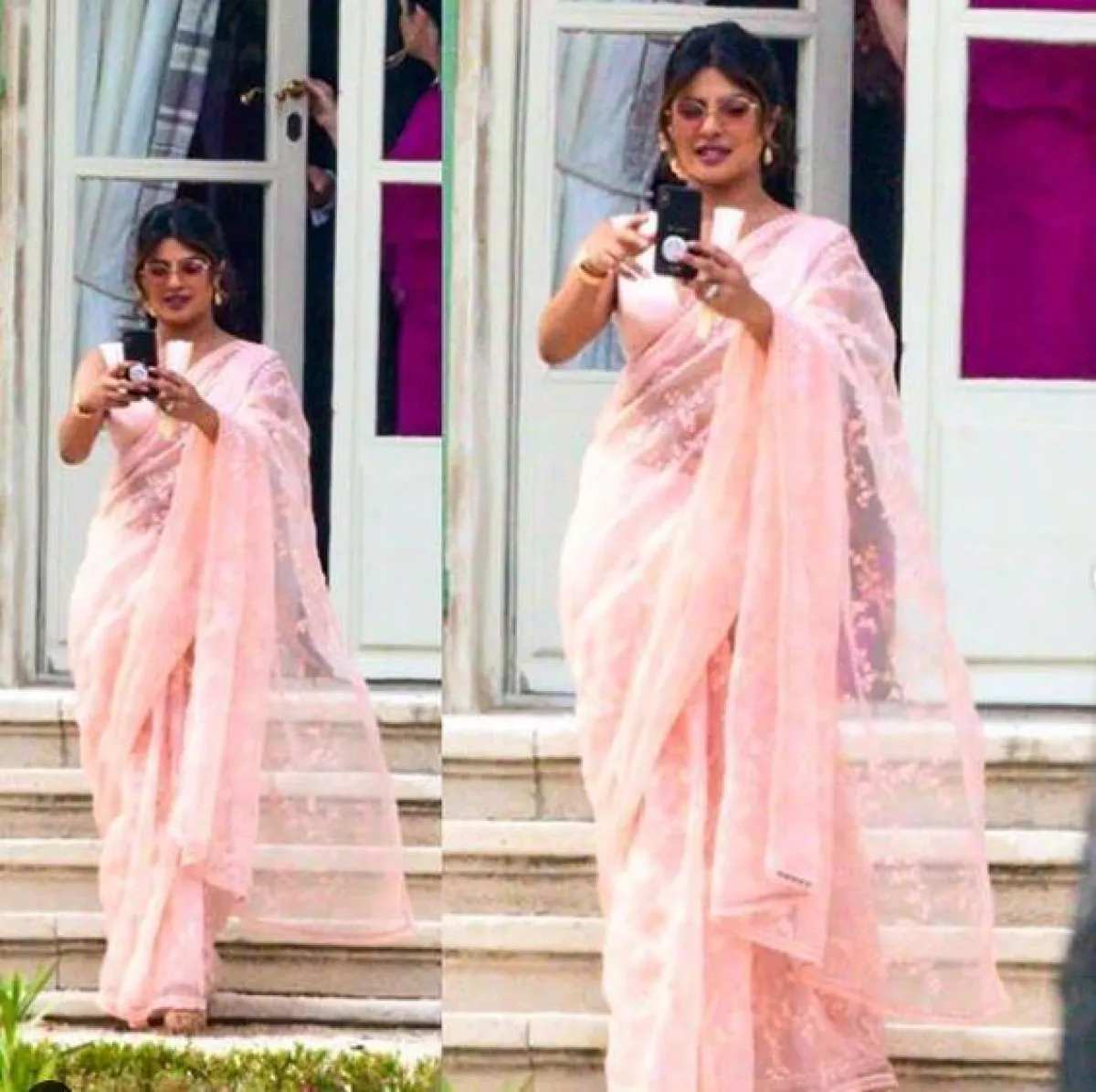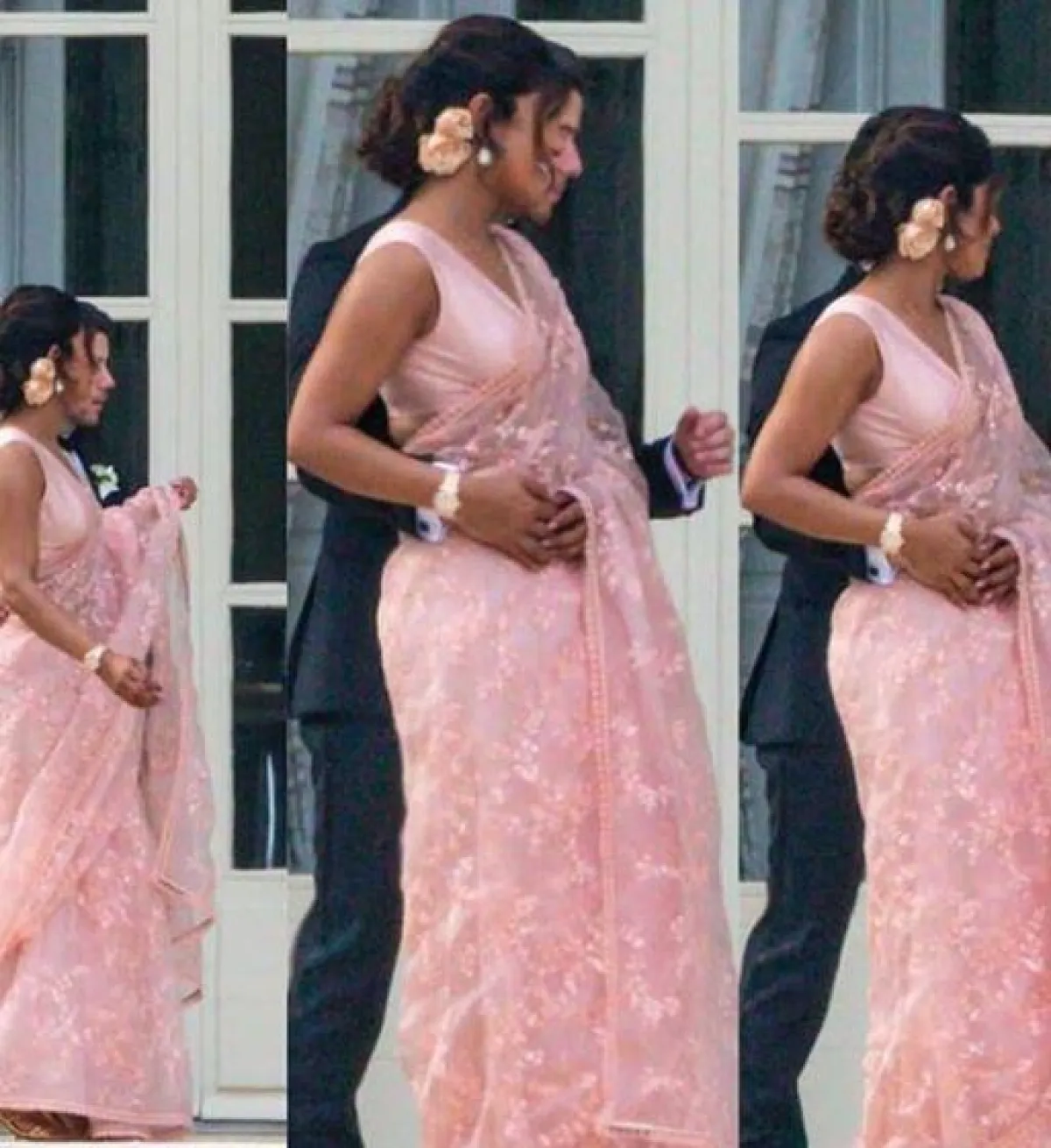 وخلال حفل الزفاف، ظهرت «بريانكا شوبرا»، البالغة من العمر 34 عاماً، بالساري الهندي الوردي، المطرز بالزخارف الأنيقة، والمؤلف من قطعتين، واعتمدت تسريحة شعر منخفضة؛ زيّنتها بورود وردية اللون، كما زادت من طولها طولاً؛ بانتعال حذاء ذي كعب عالٍ ذهبي، وأبرزت ملامح وجهها الجذاب، مُعتمدة مكياجاً طبيعياً من درجات الوردي.