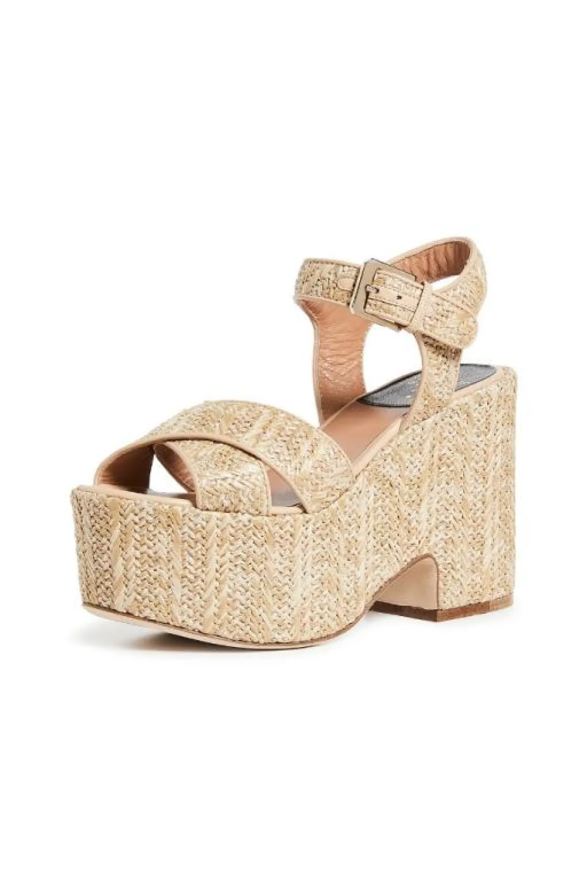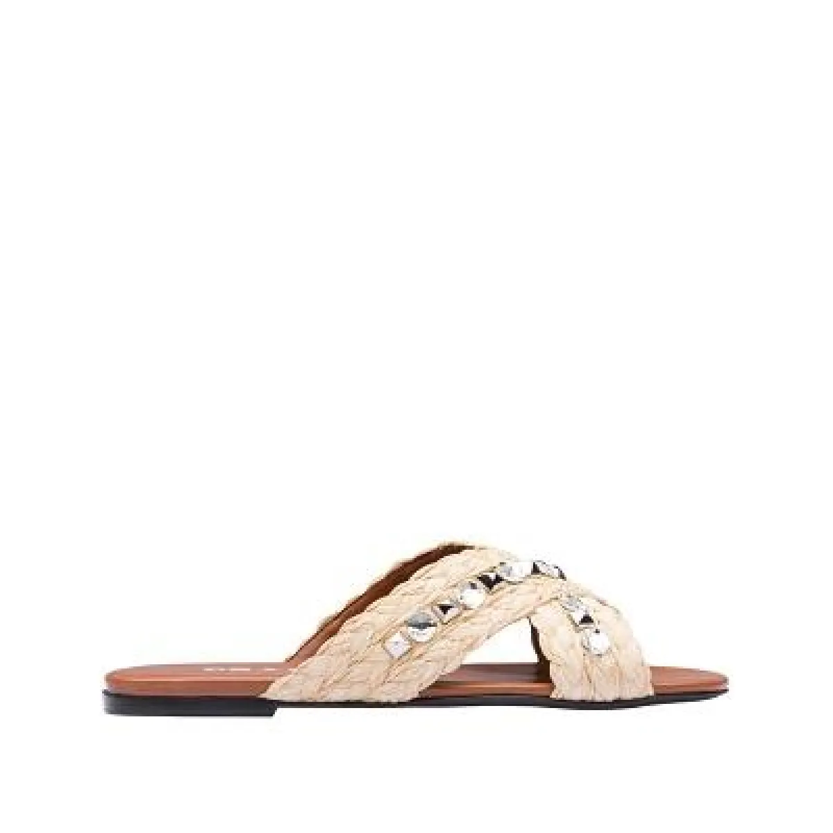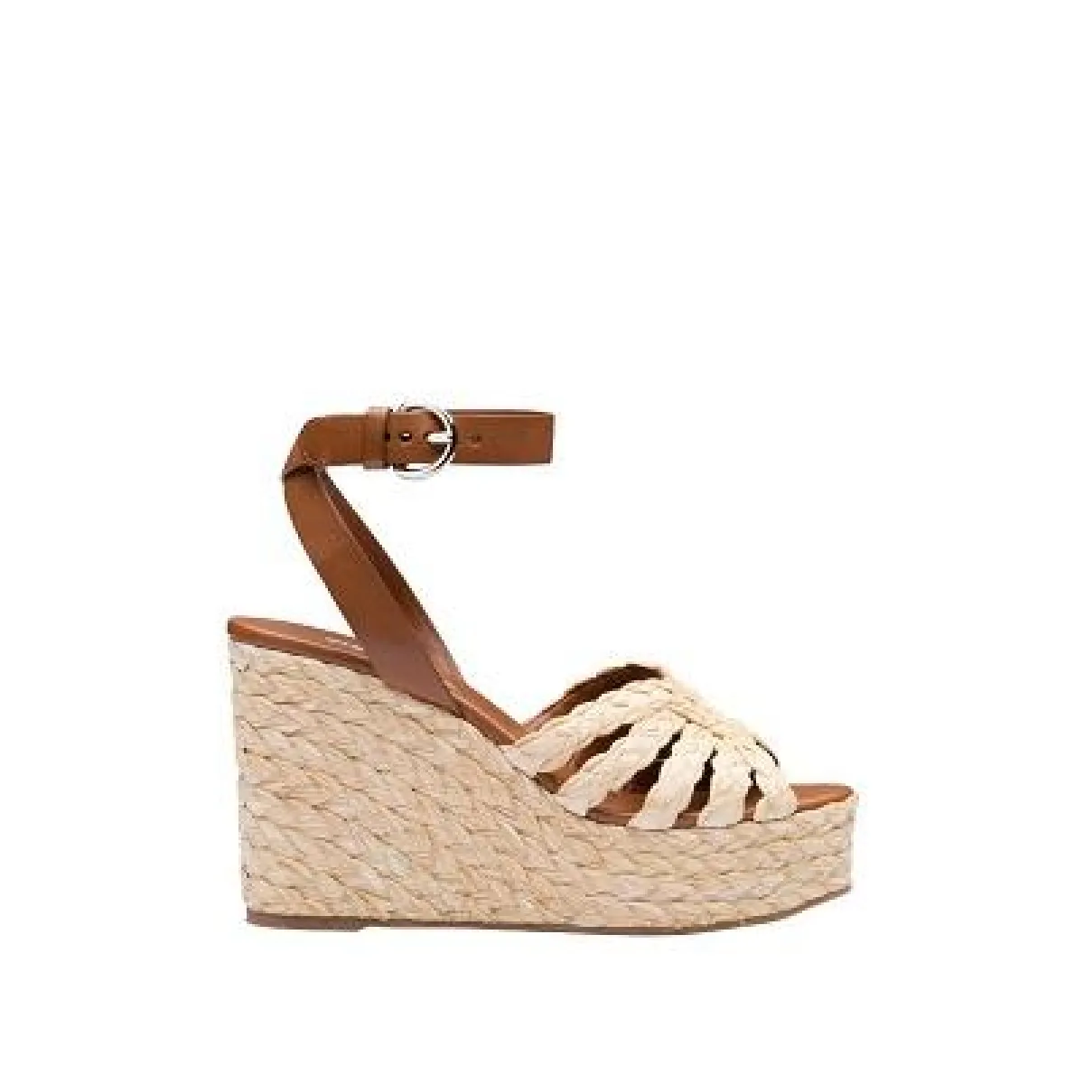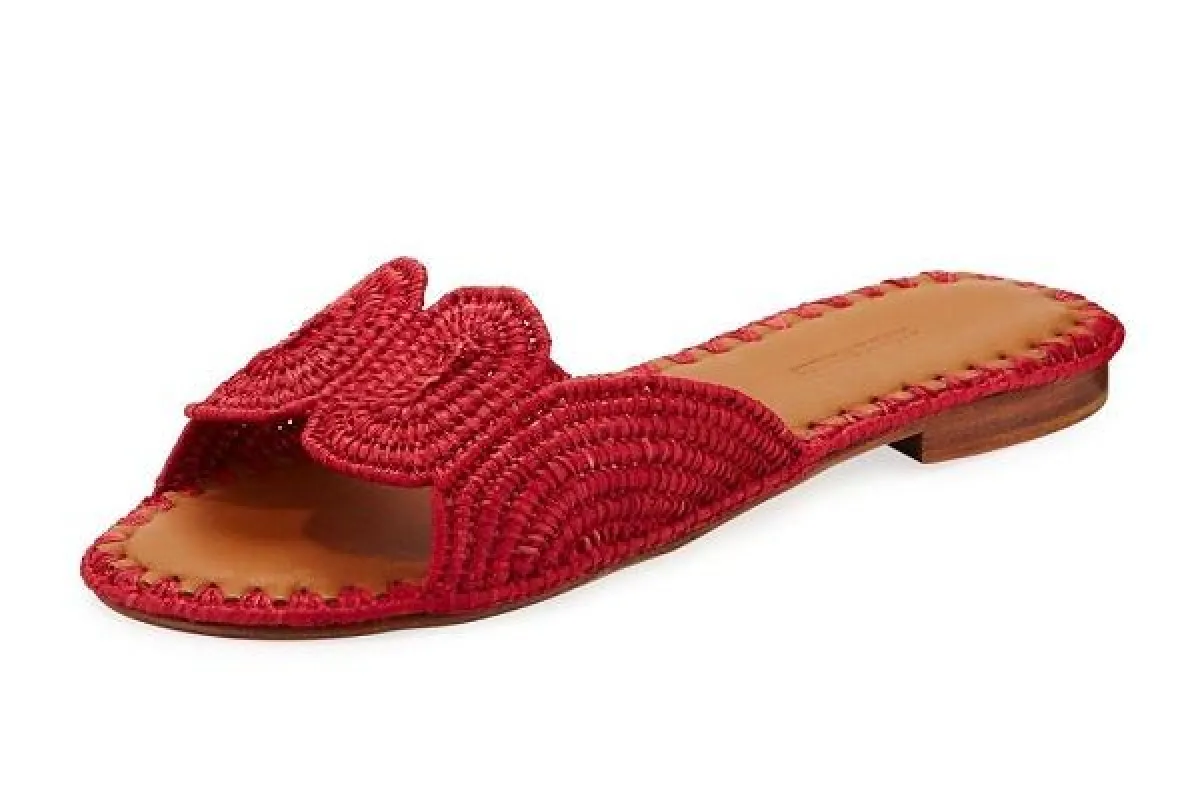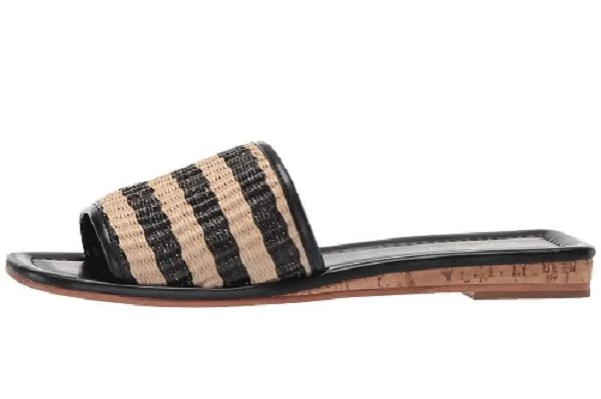 أعادت ماركة مالون سولييه تقديم التصميم التقليدي للحذاء المفتوح من الخلف بلمسات مفعمة بالأنوثة من خلال هذا الصندل؛ حيث يأتيك بتصميم أنيق من قش الرافيا يتميز بفتحات وأربطة باللون نفسه ومقدمة مفتوحة، فضلاً عن جزء علوي من الخوص وكعب رفيع.
