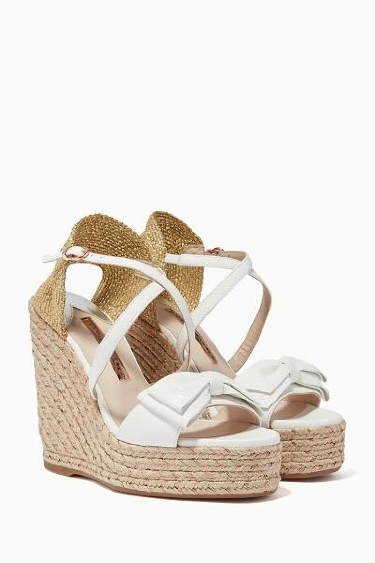 أضيفي لمسة أنثوية على ملابسك الصيفية بهذا الحذاء العملي الأنيق والمريح المزين بتصميم العقدة من صوفيا ويبستر. صُنع من الجلد الأبيض اللين، كما يتميز بكعب ويدج عالٍ من القش يضفي عليه لمسة عصرية.