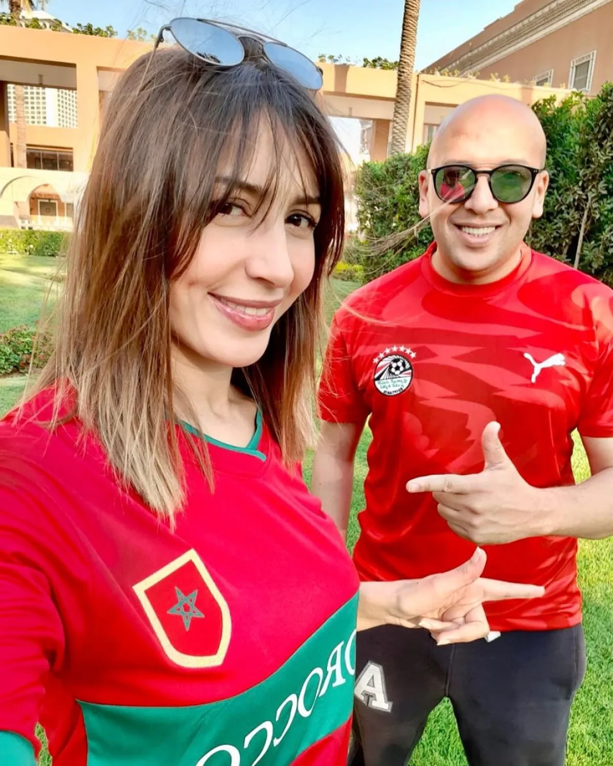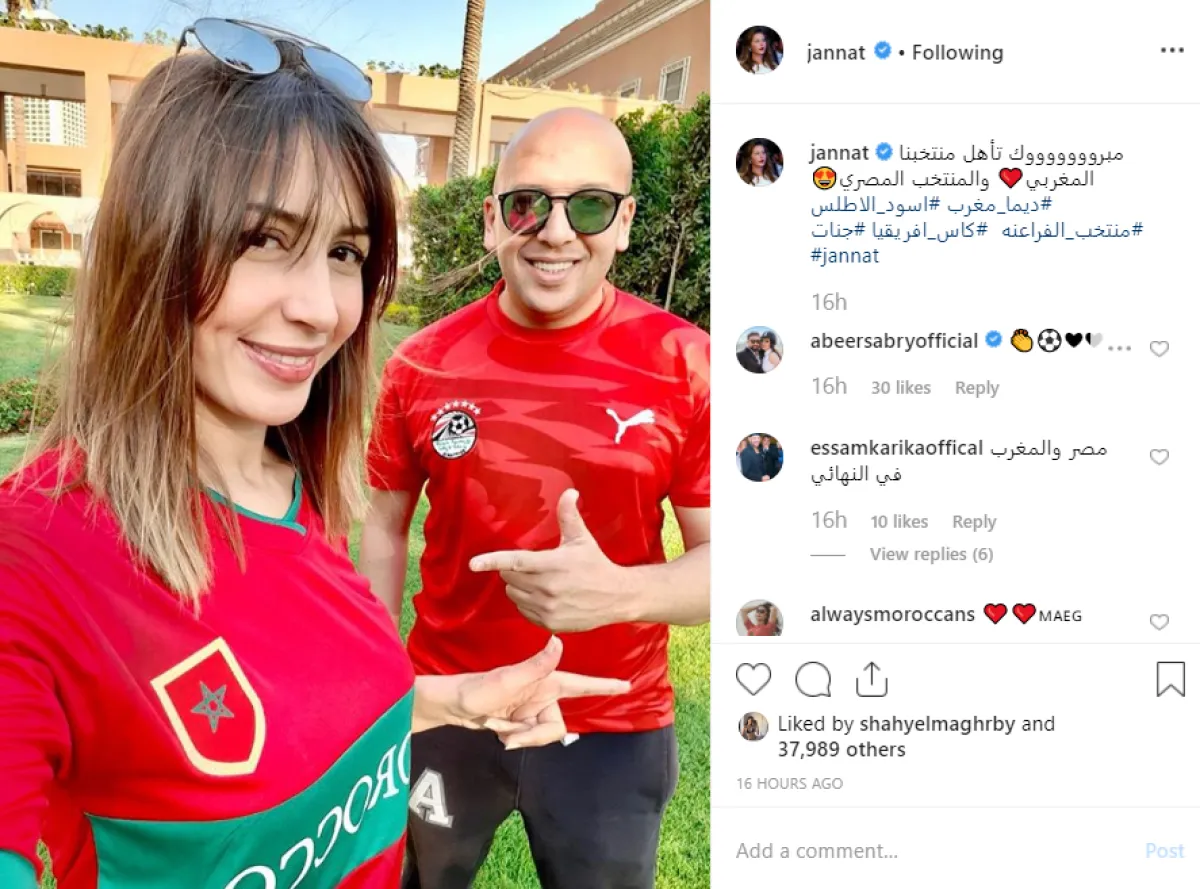 جنات ارتدت في الصورة قميص المنتخب المغربي لكرة القدم، بينما ارتدي زوجها قميص منتخب مصر، وعلقت عبر حسابها بموقع إنستقرام قائلة: مبروك تأهل المنتخبين المغربي والمصري.