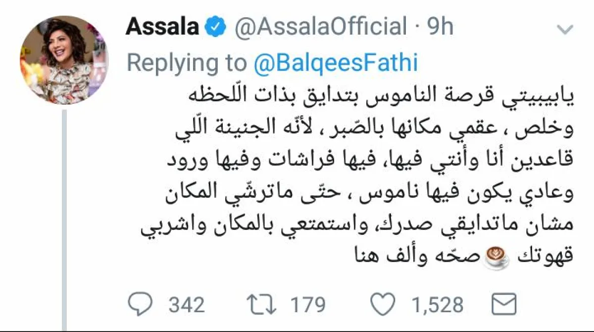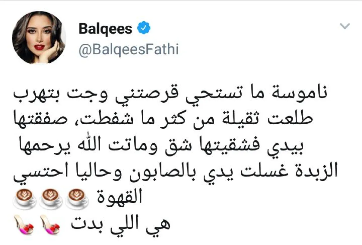 بلقيس كتيت في تغريدتها " ناموسة ما تستحي قرصتني وجت بتهرب طلعت ثقيلة من كثر ما شفطت، صفقتها بيدي فشقيتها شق وماتت الله يرحمها".