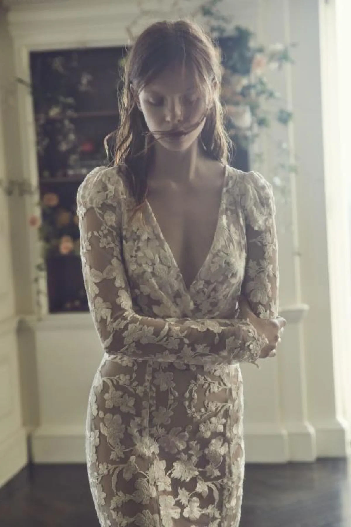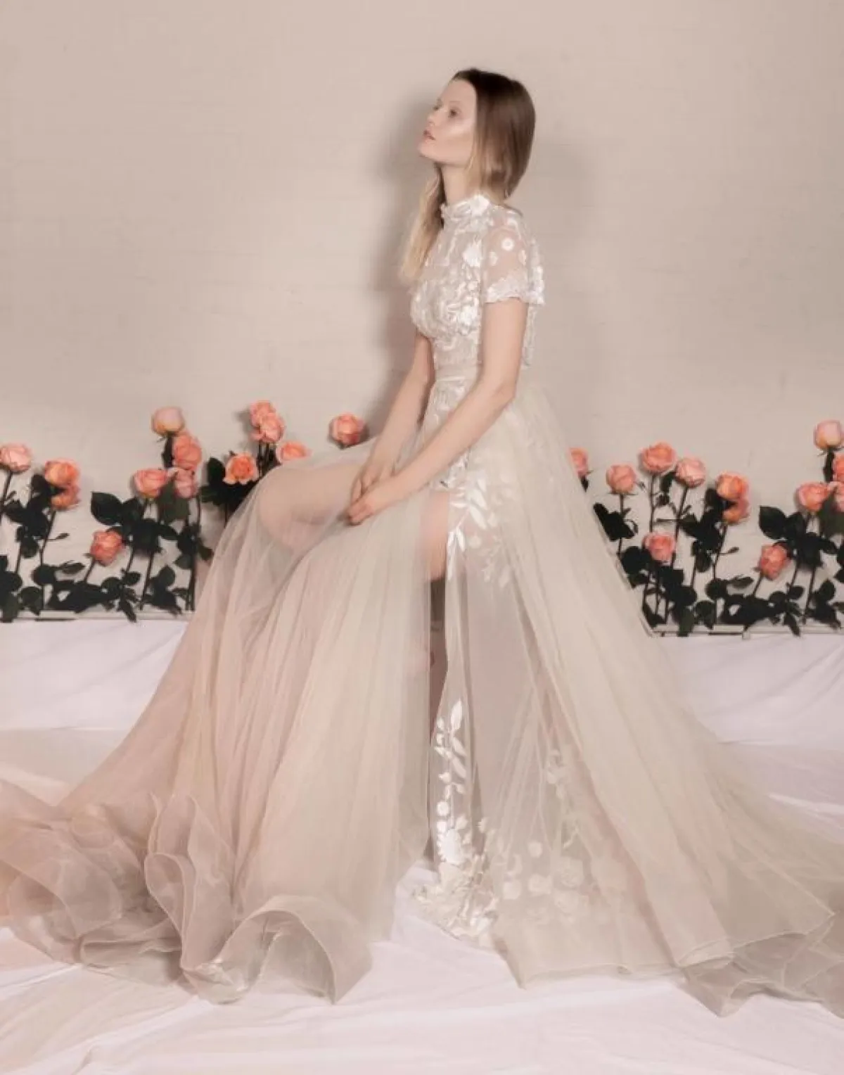 يمكنكِ اختيار الفساتين باللون السكري مع تطريزات الورود على كل الفستان، مع قصة الميرماد، مناسبة للصبيّة النحيفة، اعتمدي معها تسريحة الشعر الأملس الرطب، لاطلالة غاية في الرقة مستوحاة من الأجواء الفرنسية الرومانسية.