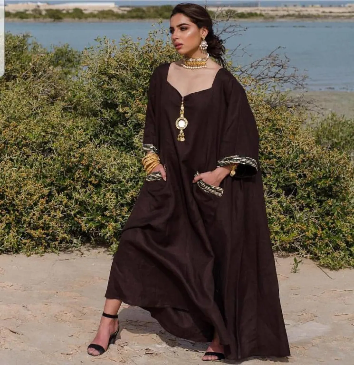 يمكنكِ اختيار العباية الواسعة المتفوحة قليلًا ناحية الصدر، مناسبة لكل الصبايا المحجبات وغير المحجبات، نسقيها مع اكسسوارات بوهيمية، والمميز بها هو خامتها المريحة من الكتان، كالعباية من Shoug Alnaqde شوق الندى، ولفة الحجاب باللون الأبيض سوف تبدو مميزة مع هذه الدرجة البنية.