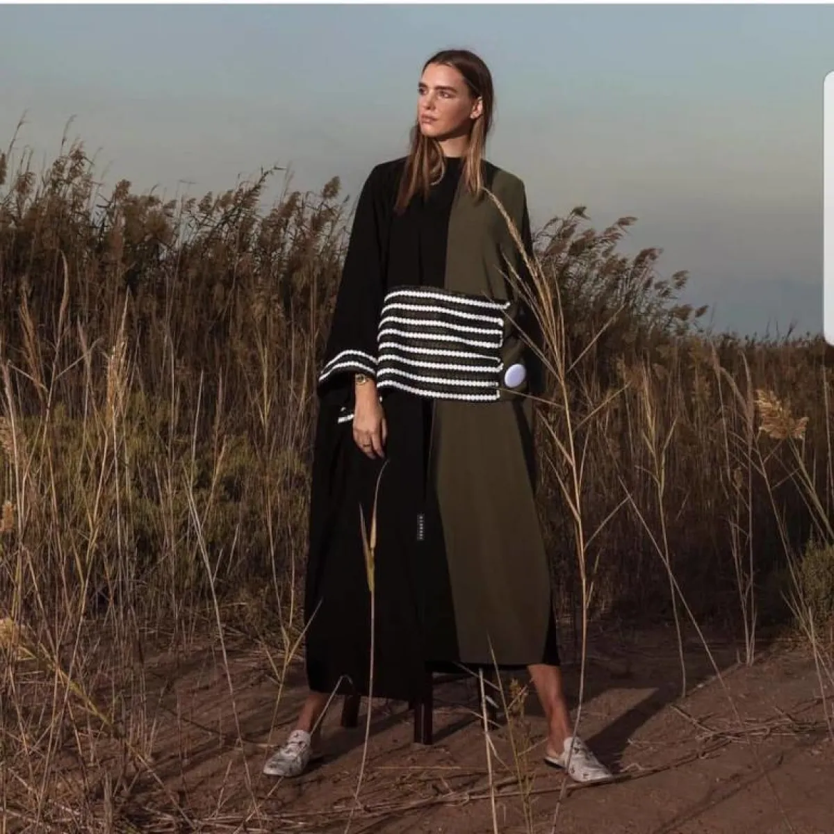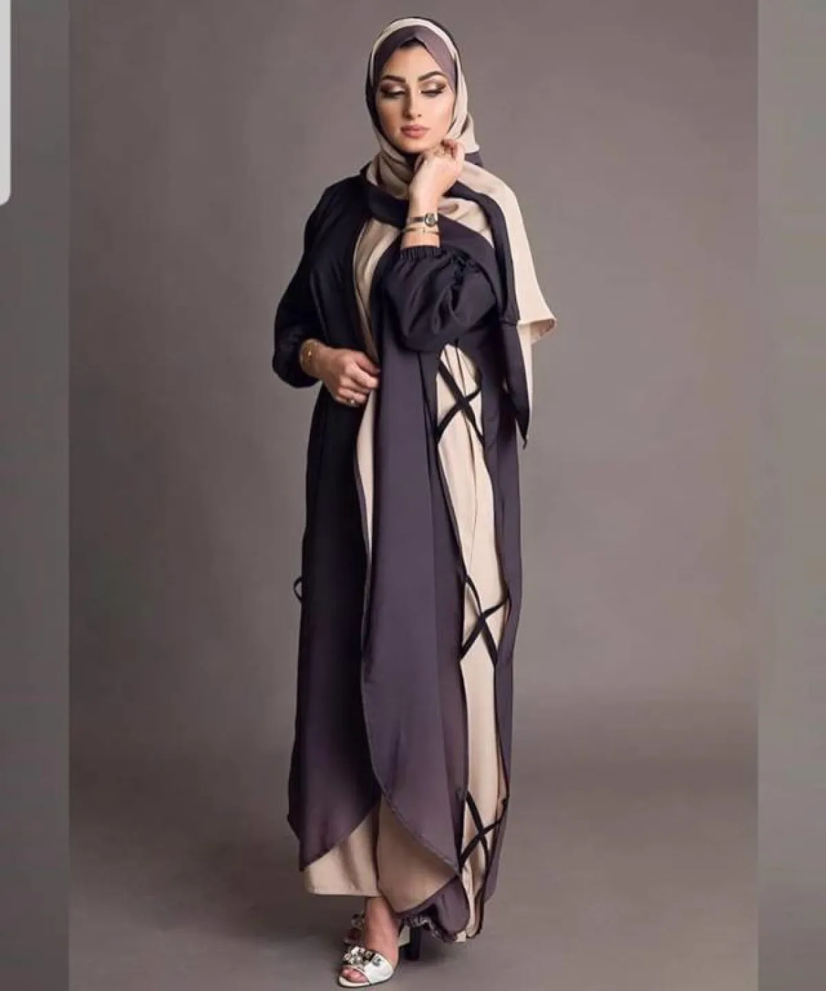 إذا كنتِ تحبين الألوان الداكنة بشكل عام، فهذا الموديل من Aladaaj سوف يناسب ذوقكِ، مع التصميم المنقسم لكلا اللونين الأبيض مع الأسود، نسقي معها لفة حجاب باللون البيج الفاتح، وصندلًا بدرجات النود.