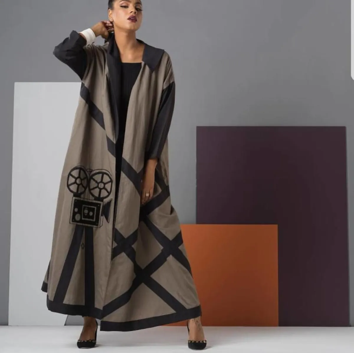 لفتنا العبايه باللون البني الرمادي من Leenaz ليناز، مع رسومات غير تقليدية مستوحاة من أجواء السينما، لاطلالة لافتة للأنظار بالتأكيد، نسقيها مع أحذية ميتالك فضية وحجاب أسود عريض، ليكتمل اللوك المحايد.