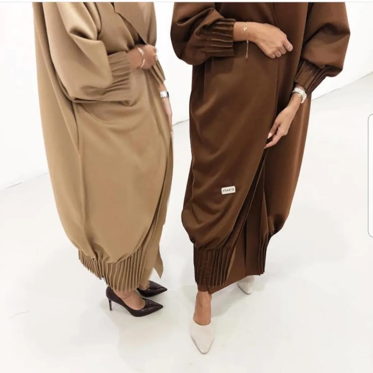 بإمكانكِ دمج لوني البني والبيج معًا بتصميم واحد، كهذا التصميم من The Fj Couture عبايه باللون البني مع البيج من ذا فاي كوتيور، كأن تختاري اللون البني كطبقة شيفون، مع لون البطانة البيج الفاتح، للمسة عصرية ومتناغمة، نسقي معها حجابًا أبيض، أو بيج، ويمكنكِ اختيار كعب عالٍ ذهبي اللون، للسهرات، للمسة أكثر كلاسيكية.