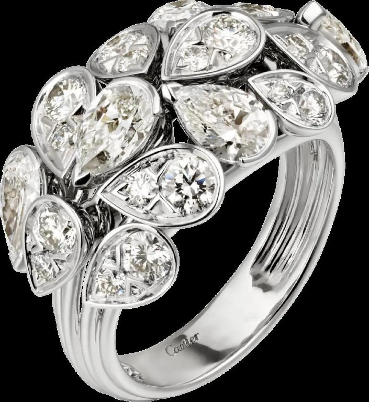 من دار كارتييه Cartier العريقة في تصميم المجوهرات، انتقينا لكِ خاتماً من مجموعة PLUIE DE CARTIER الفاخرة، المصمم من الذهب الأبيض عيار 18 قيراطاً، والمرصّع بحبات الألماس البراقة.