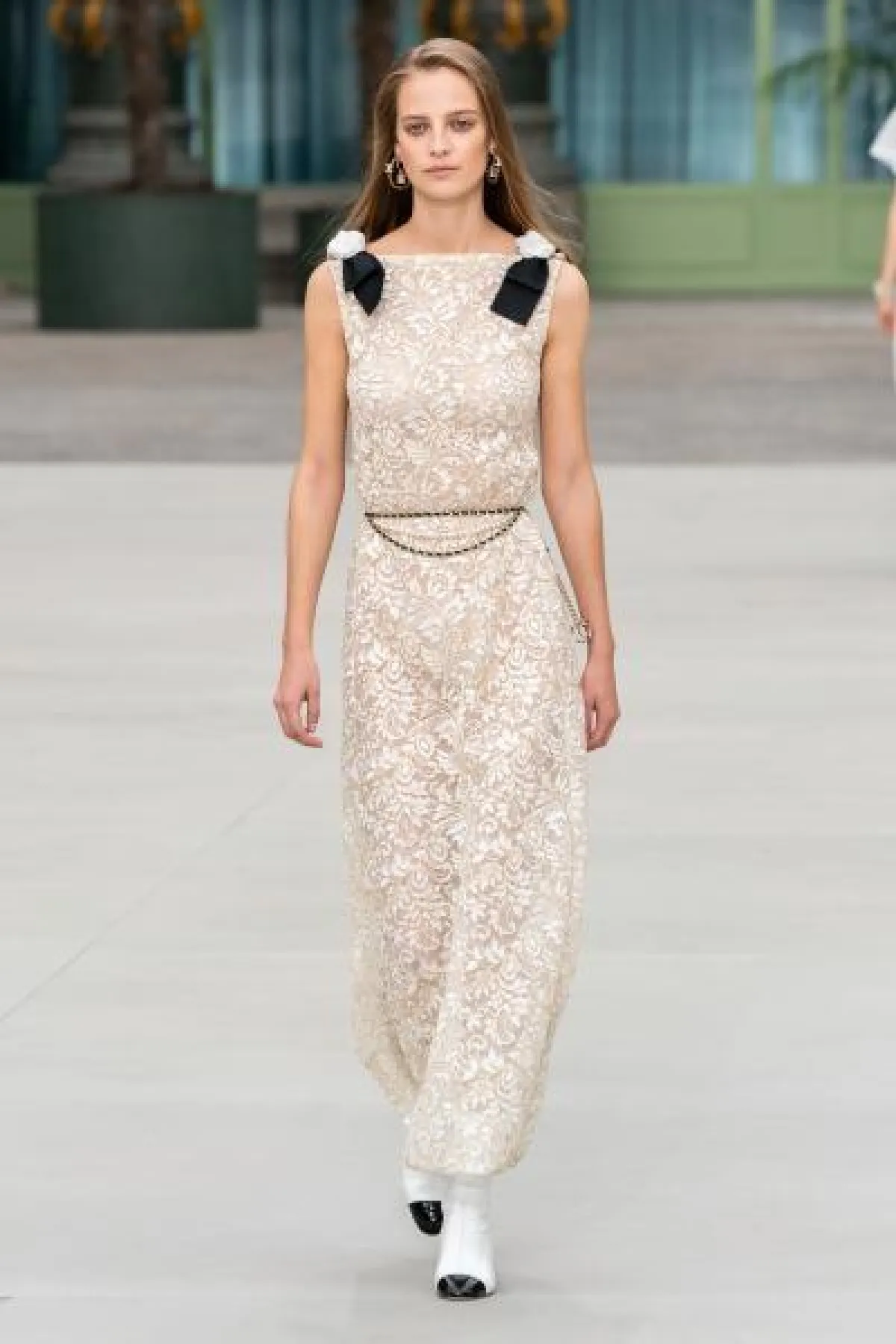 تهادت عارضات دار شانيل Chanel بفساتين دانتيل بيضاء أتت بقصة مستقيمة ولكن غير ملاصقة للقوام تمامًا، ولكن أحذري اللجوء إلى هذا الموديل اذا كنتِ ممتلئة القوام حتى لا يركز النظر على عيوب جسمك.