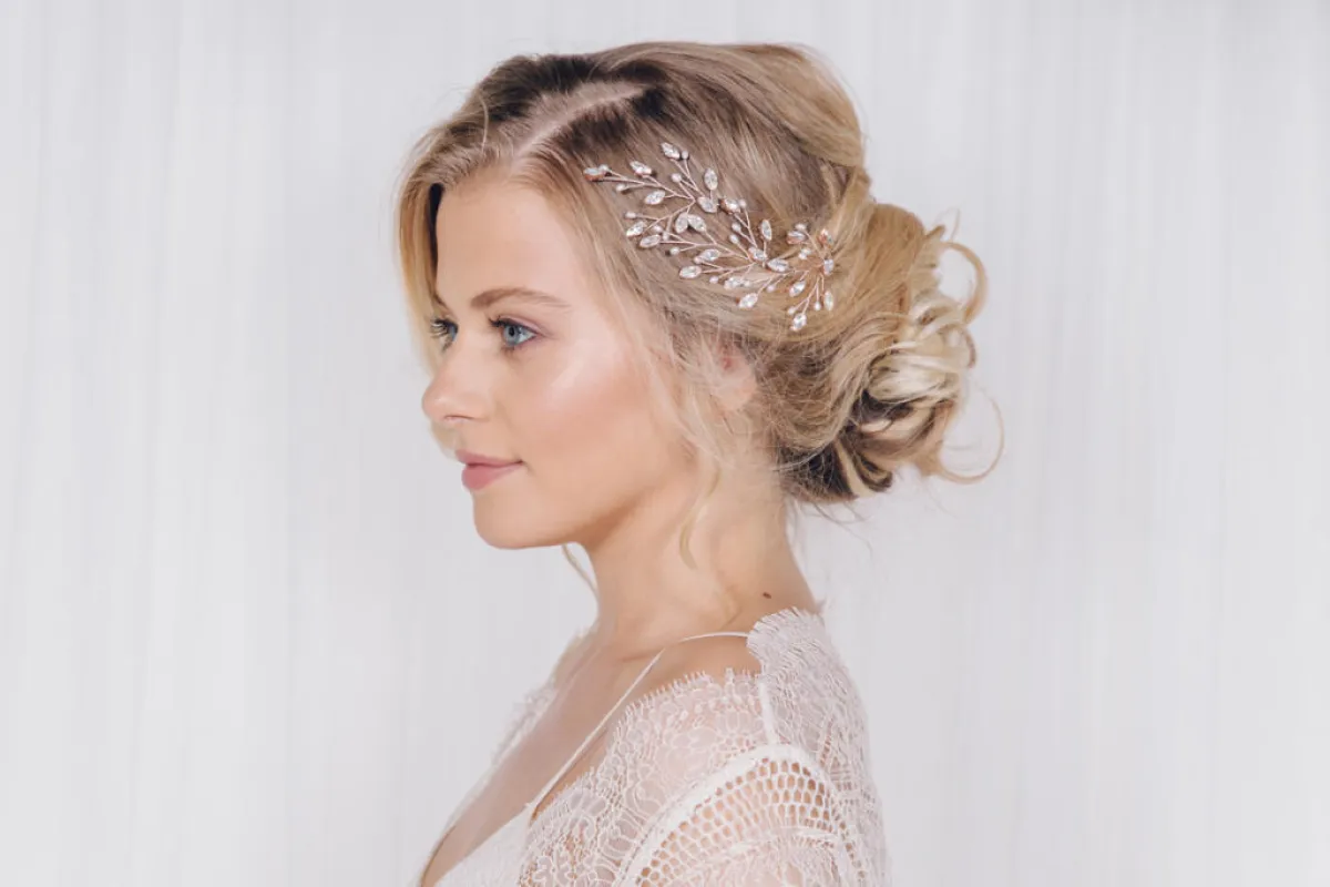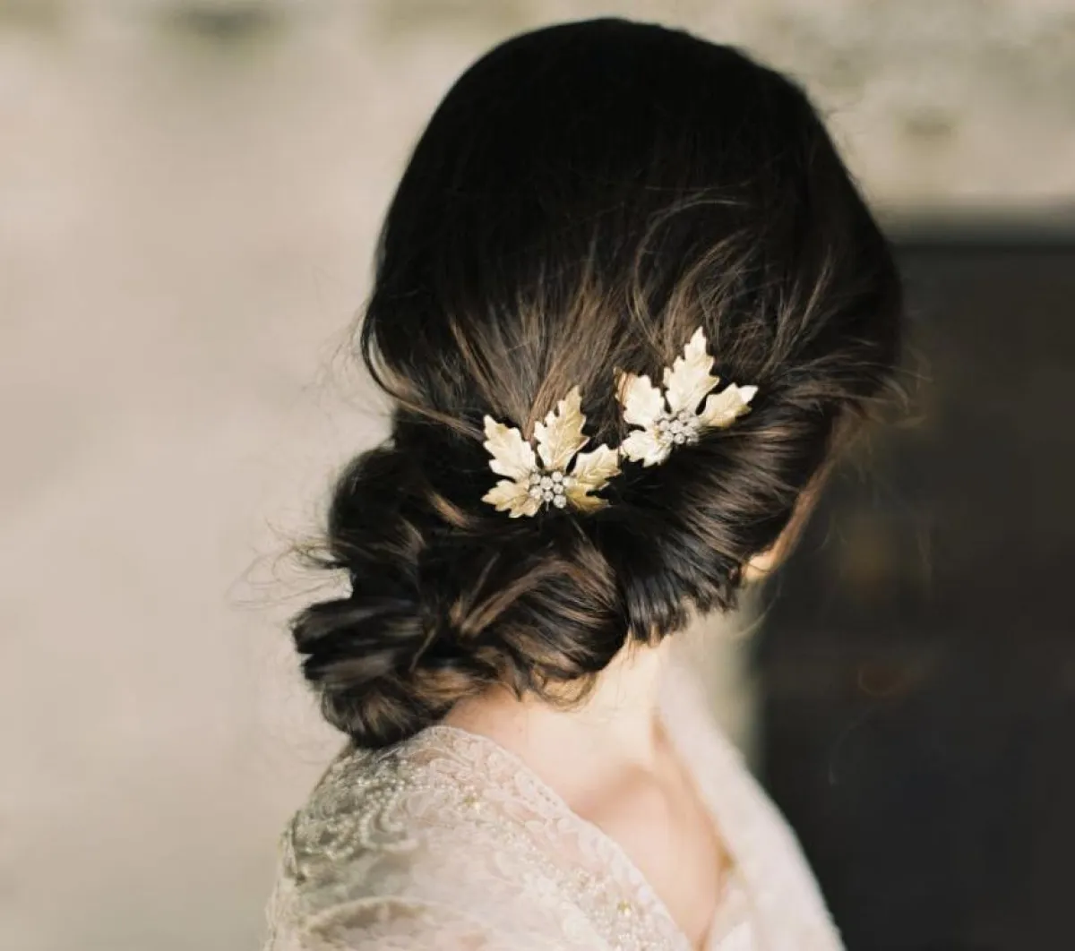 من اللمسات المناسبة لكِ إن أردتِ الحصول على اطلالة مخملية، هو اختيار اكسسوار الورود باللون الذهبي، بحيث يكون على شكل فروع الأشجار مثلًا، كالطول صغير الحجم، مع شعر العروس الذهبي.
