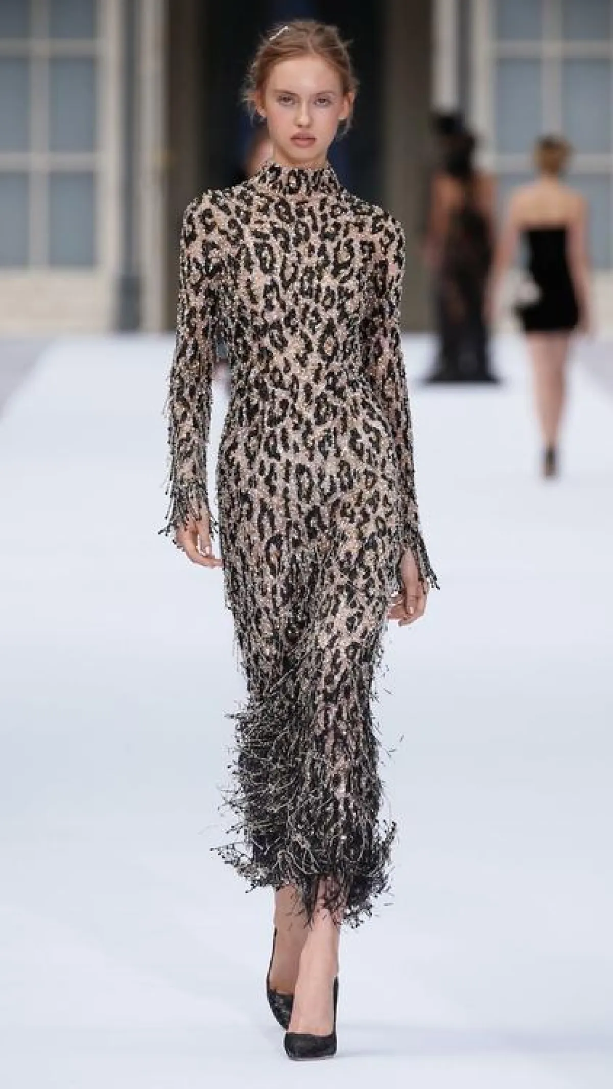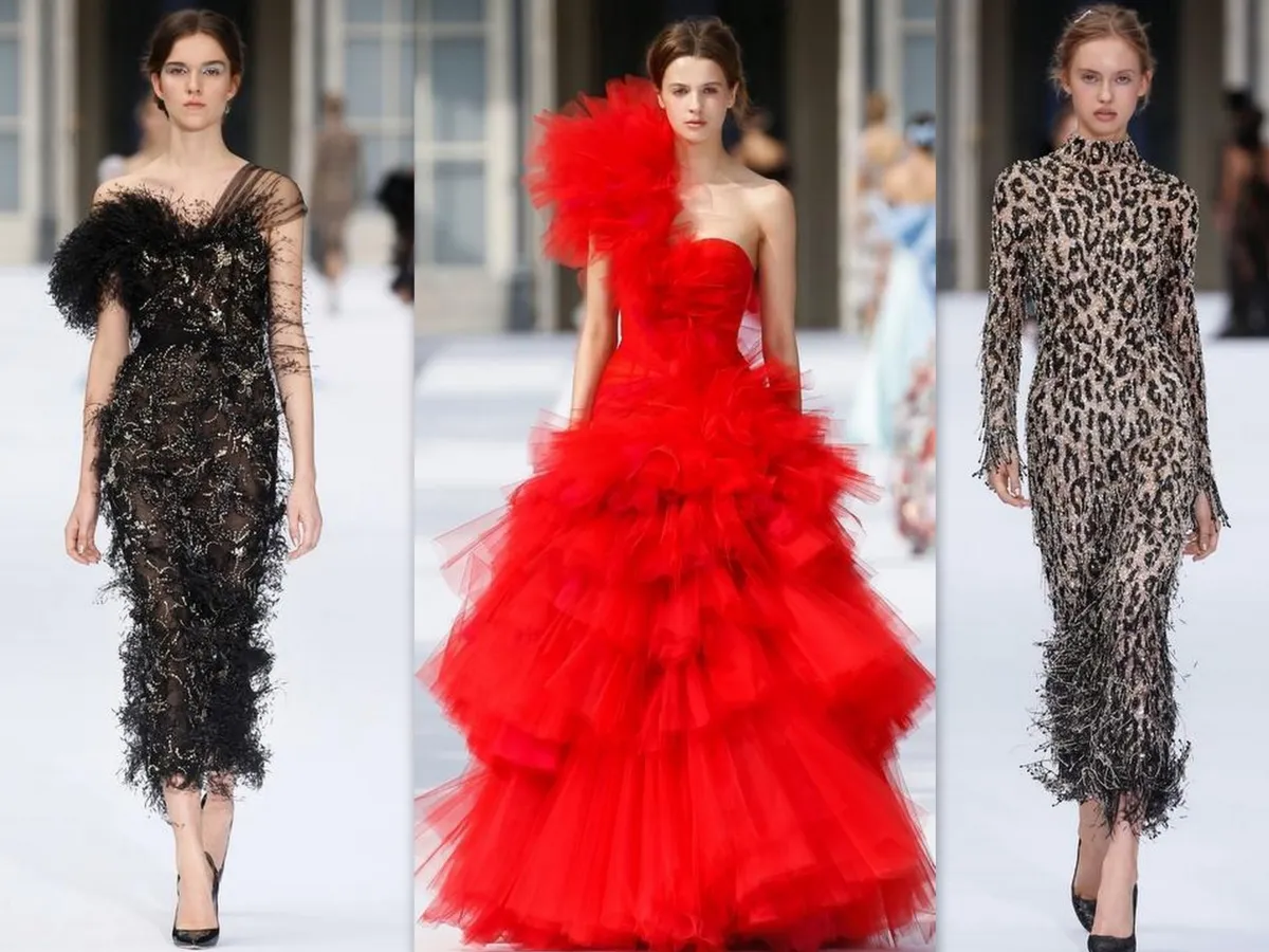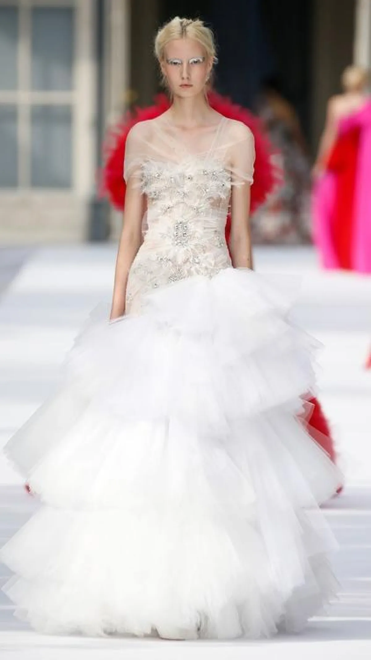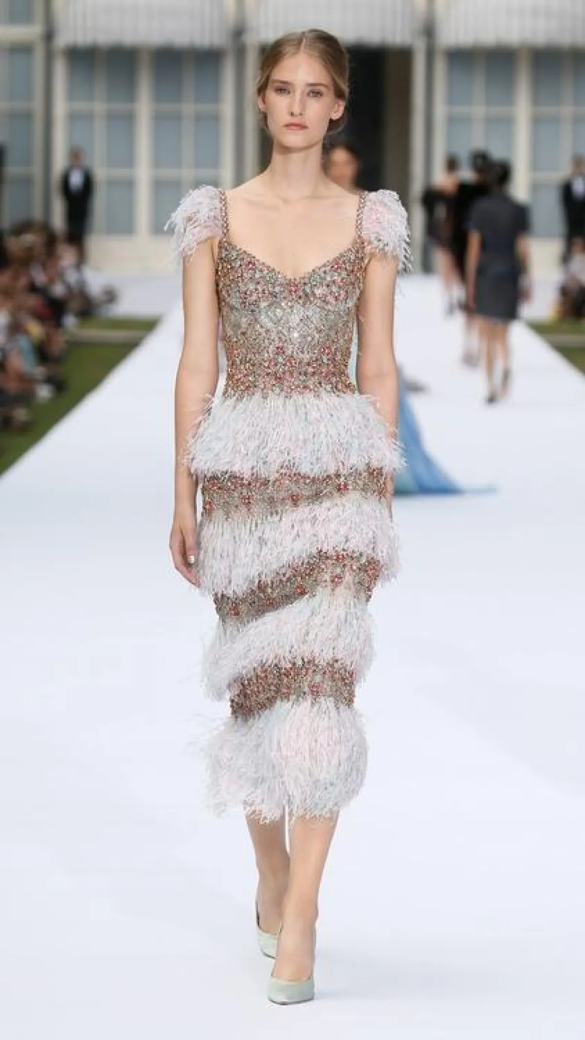 كما سيطرت الفساتين المغطاة بالريش الأبيض الناصع وتلكَ المزينة بالأحجار الكريمة الملونة.