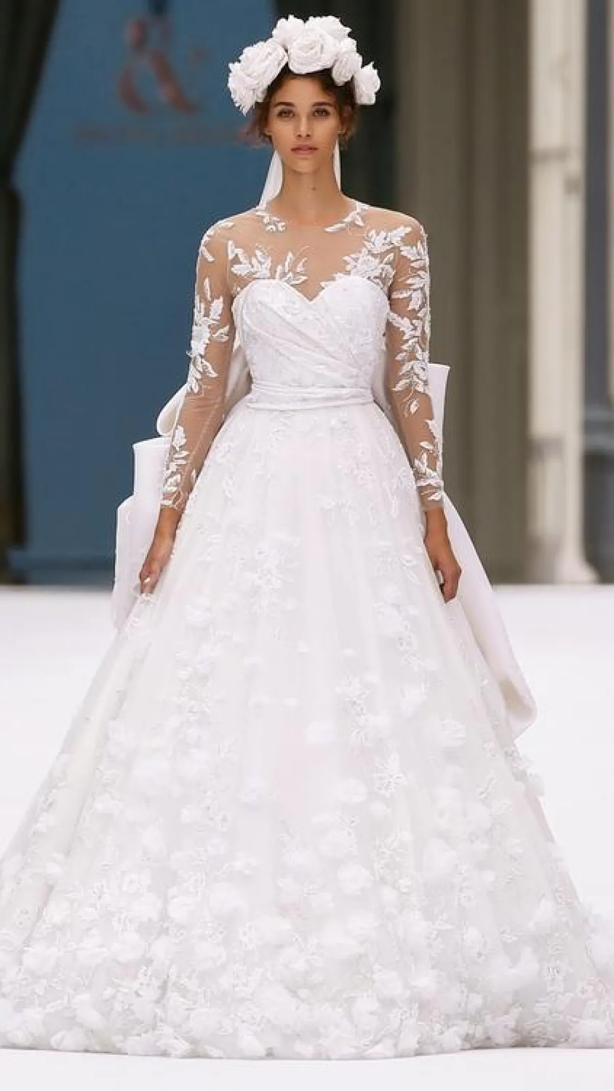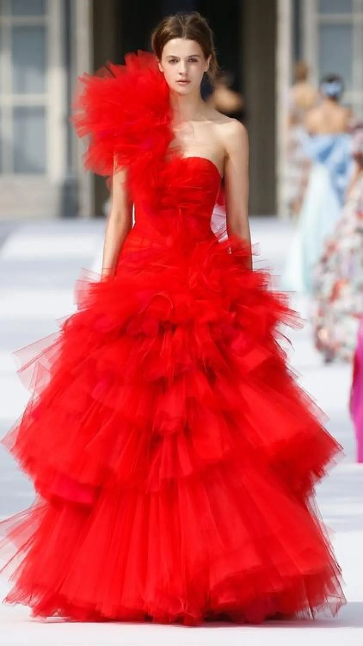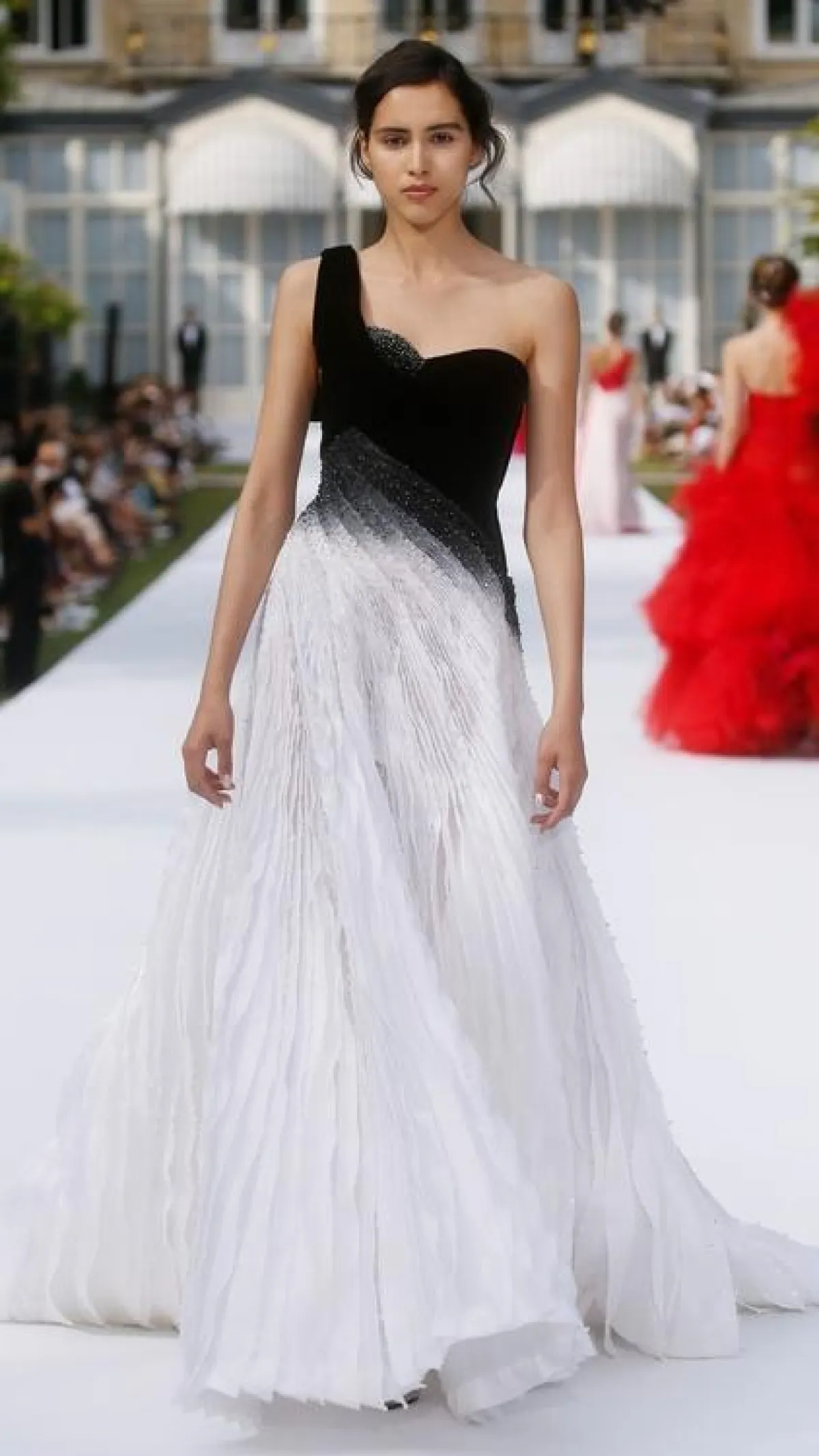 كما سيطرت الفساتين المغطاة بالريش الأبيض الناصع وتلكَ المزينة بالأحجار الكريمة الملونة.