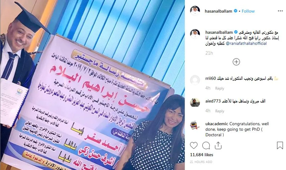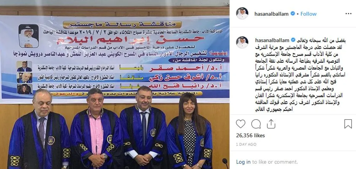 نشر الفنان الكويتي حسن البلام عبر صفحته الرسمية في"إنستقرام" صورة له لدى مناقشته رسالة الماجستير، وكتب تعليقاً عليها:"بفضل من الله سبحانه وتعالى حصلت على درجة الماجستير مع مرتبة الشرف من كلية الآداب قسم المسرح بجامعة الإسكندرية مع التوصية الشرفية بطباعة الرسالة على نفقة الجامعة، والتبادل مع الجامعات المصرية والعربية.شكراً شكراً أستاذتي بالقسم،شكراً مشرفتي الأستاذة الدكتورة رانيا فتح الله على كل شيء قمتِ به معي،شكراً أستاذي ومعلمي الدكتور أحمد صقر رئيس قسم الدراسات المسرحية بجامعة الإسكندرية،شكراً الفنان والأستاذ الدكتور أشرف زكي على قبولك المناقشة.أحبكم جمهوري الغالي".