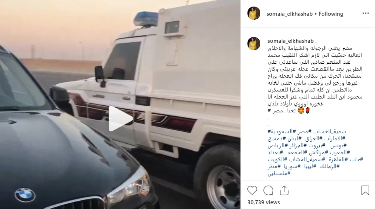 سمية نشرت عبر حسابها الخاص بمقطع إنستقرام مقطع فيديو يظهر أحد مجندي الشرطة المصرية وهو يقوم بإعادة تركيب إطار سيارتها الخاصةـ وعلقت على الفيديو قائلة: مصر يعني الرجولة والشهامة والاخلاق العالية حسّيت إني لازم اشكر النقيب محمد عبد المنعم صادق اللي ساعدني على الطريق بعد ما اتقطعت عجله عربيتي.