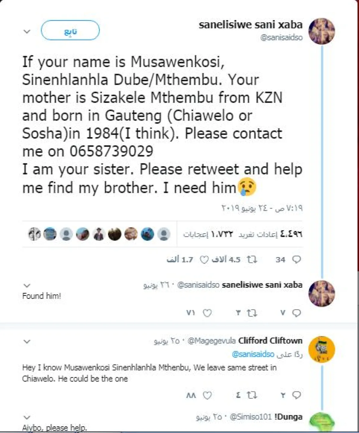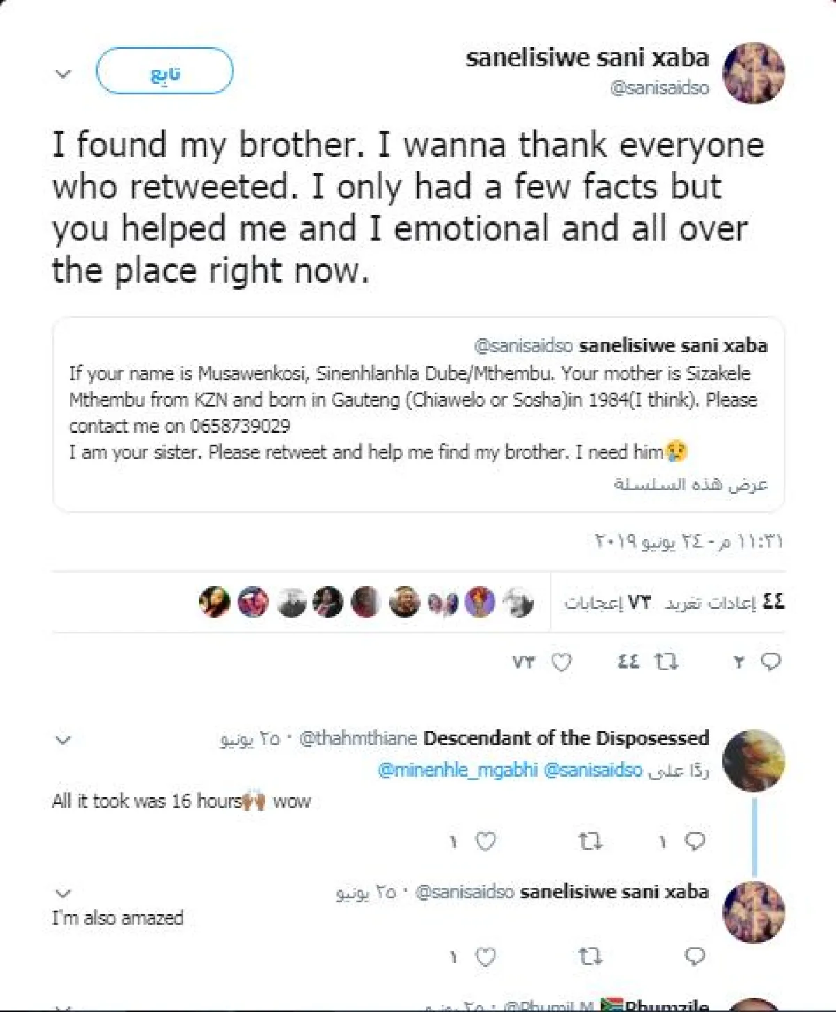 الفتاة الجنوب أفريقية التي كانت قد صرّحت لصحيفة «مترو» بأنها لطالما أحست بالفقد والنقصان دون وجود أخيها إلى جانبها، حيث كانت تتساءل دائماً إن كان بخير، وأنها أرادت حقاً أن تلتقيه، لأنها بحاجة إليه، أصيبت بحالة كبيرة من الصدمة والدهشة صباح اليوم التالي من نشرها للتغريدة، حيث وجدت رداً بالفعل عليها من أخيها «موسافينكوسي دوبي- ماتيبو»، البالغ من العمر 35 عاماً الآن والذي كان مفقوداً منذ عقود عديدة. وعادت «سانليسيفا»، بإعادة نشر تغريدتها في اليوم التالي، وعلّقت عليها قائلة: «لقد وجدت أخي. أريد أن أشكر كل من قام بإعادة التغريد. لم يكن لديّ سوى بعض الحقائق ولكنها ساعدتني».