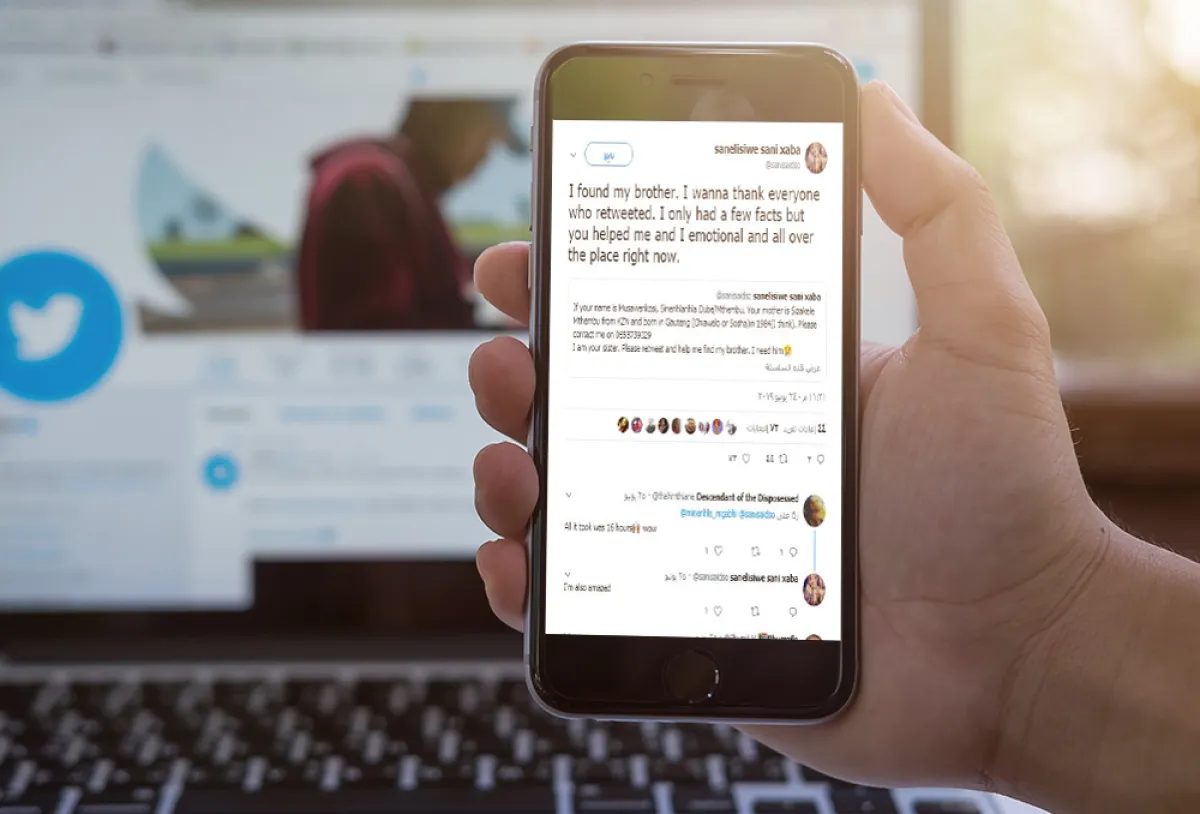 مع وجود وسائل التواصل الاجتماعي في كل مكان، كان من البديهي أن تبدأ «سانليسيفا» رحلة بحثها من على هذه الصفحات، وقامت بنشر «تغريدة» عبر حسابها على موقع «تويتر»، يوم الإثنين 24 حزيران/يونيو الماضي، كتبت فيها: «إذا كان اسمك «موسافينكوسي دوبي- ماتيبو»، وكنت قد وُلدت في محافظة «غاوتينغ» في العام 1984، أرجوك أن تتصل بي.. فأنا أختك، أجب على تغريدتي من فضلك». وتابعت الفتاة تغريدتها: «من فضلكم ساعدوني في العثور على أخي.. إنني بحاجة إليه».