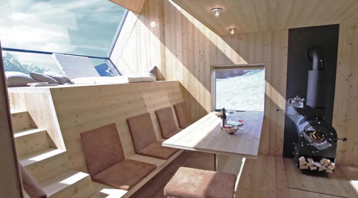 منزل المقصورة الجبلية هو أيضاً منزل فريد من نوعه، ولكنه صغير جداً، يتميز بلونه الرمادي المميز، ويعتبر علامة بارزة في تلك القرية، تبلغ مساحة المنزل 87 متراً مربعاً، وهو متاح للإيجار للسياح.