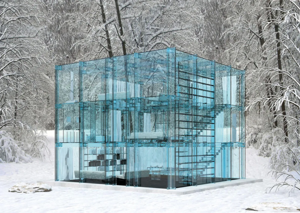 هذا المنزل مصنوع من الزجاج بالكامل، وتم بناؤه باستخدام إطار من الزجاج الأزرق الفاتح والألوان الفولاذية، وقد تم تصميم منزل الثلج؛ عبر شركة تصميم مقرها في ميلانو الإيطالية، والمميز أيضاً أنه حتى المفروشات الداخلية قد صنعت باستخدام نفس الزجاج.